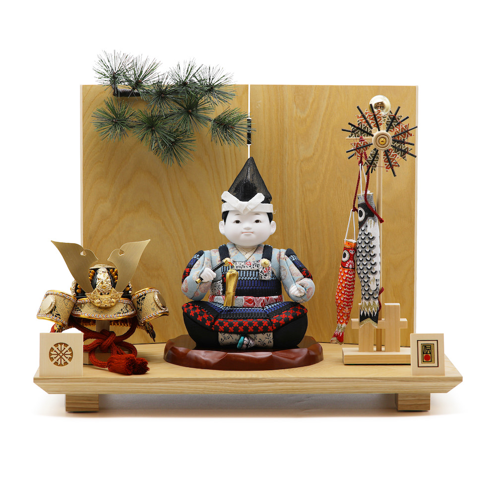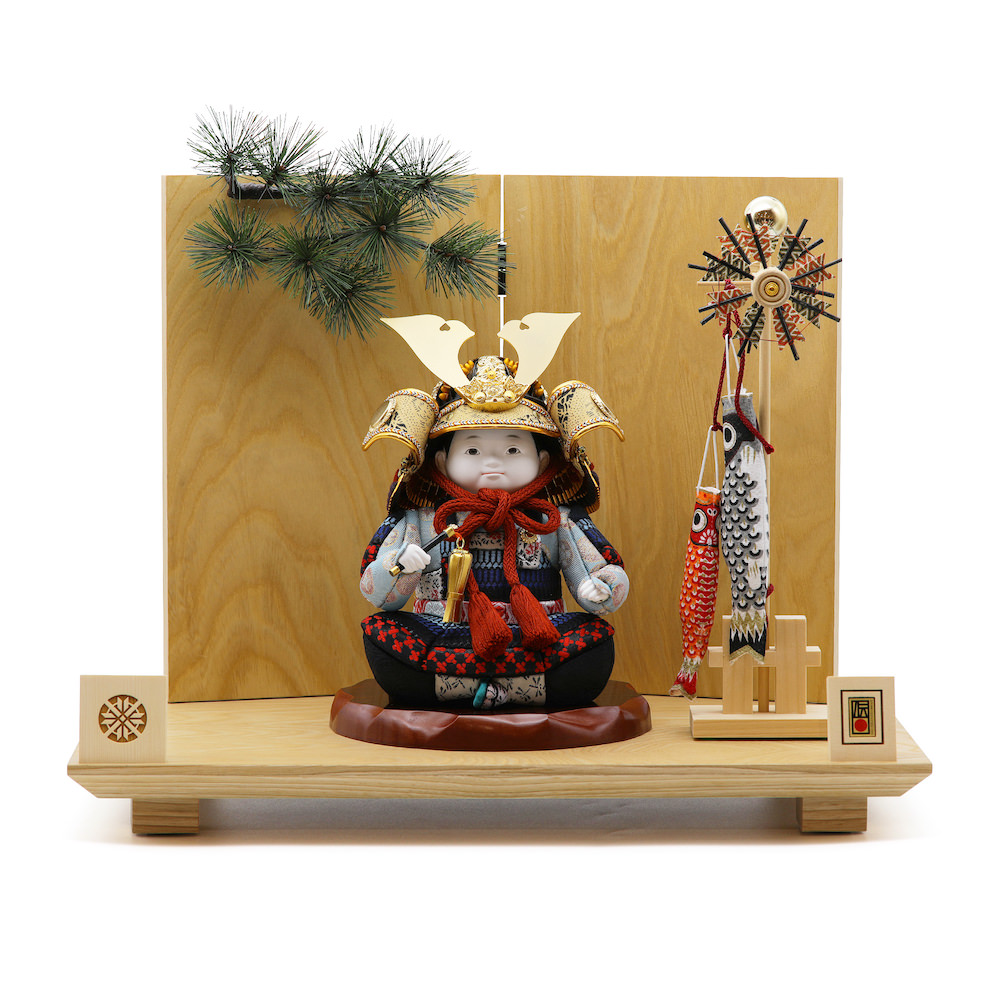 小物は、屏風に引っ掛けるタイプの松葉。松は通年葉を枯らすことがないことから長寿や生命の象徴とされる縁起の良いモチーフです。大変存在感のあるアクセントです。飾り台と屏風に合わせて白木の鯉のぼりを飾りました。男の子、端午の節句らしさを感じる品です。シンプルな洗練された美しさ、お人形の可愛らしさを感じる武者人形飾りです。