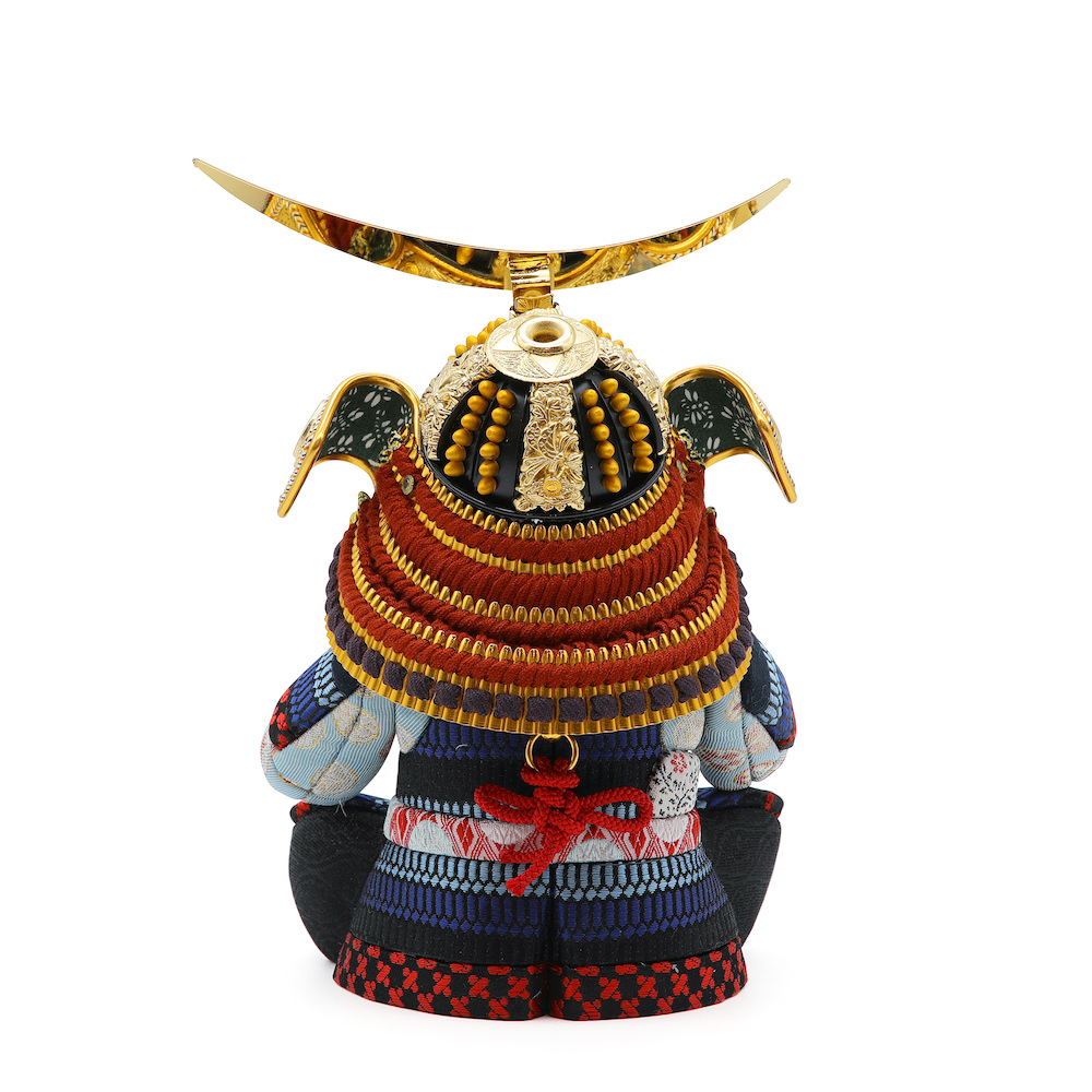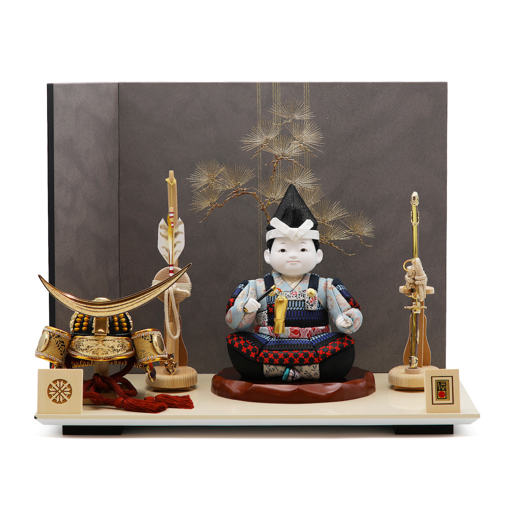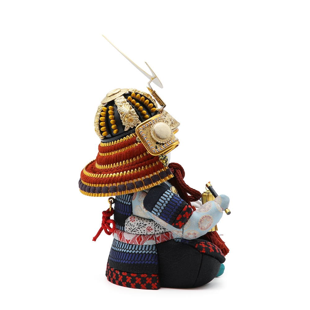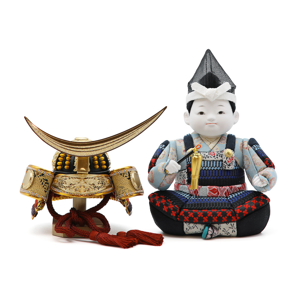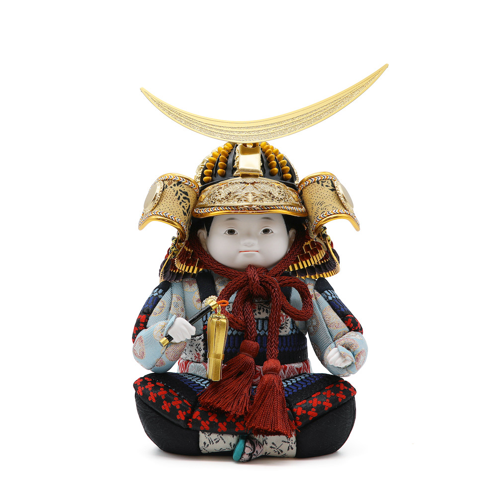 可愛らしくも、たくましい幼顔のお顔の武者人形、お顔と手は瀬戸焼で製作されていることから伝統的工芸品の認定を受けている品です。お衣装は伝統的でも現代的な印象に、工房真こだわり国内最高品質の正絹の織物を使用しています。水色の地に紋様が描かれた可愛らしくも伝統的な日本の柄の衣装に、鎧の威糸を再現した織物を木目込んでいます。目立たない点ですが、具足、草履部分に「勝ち虫」と言われ古来から縁起の良いとされるトンボを描いた織物を合わせ仕上げました。