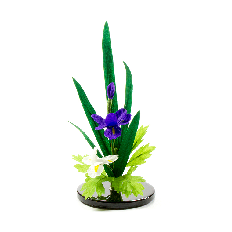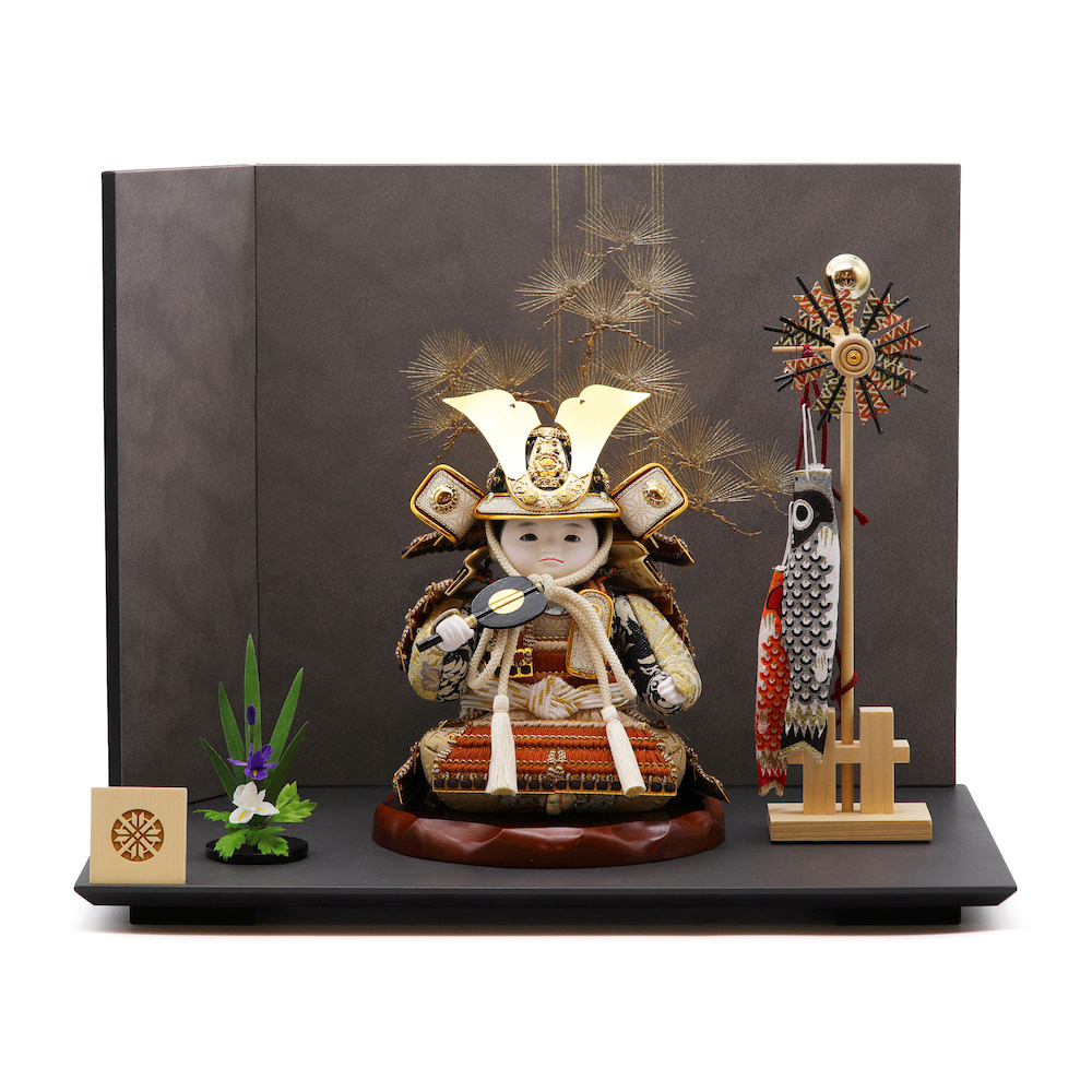 小物は白木で製作した鯉のぼりと菖蒲の花。端午の節句らしさ、可愛らしさをプラスしました。飾り台と屏風をグレートーンでまとめることで、武者人形の存在感が際立つ大変魅力的な飾りです。