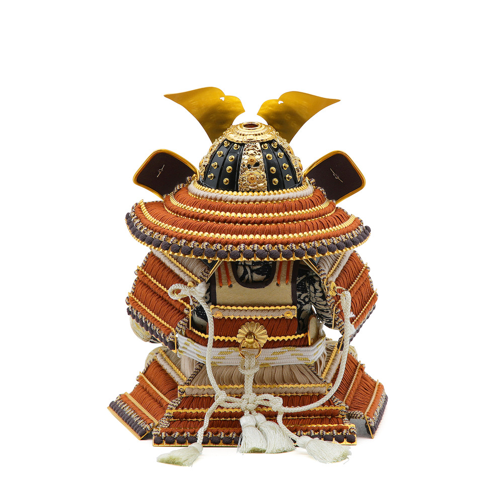お人形に着せた鎧兜は、正絹の威糸や紐を使用し、工房真の武者人形専用に熟練の職人が製作する小さいながらも本格的な国産鎧兜です。兜や鎧各所には鹿革で製作した白地の花柄の印伝。大きな鍬形に薄煉瓦色(テラコッタ色)、ベージュ色の糸でまとめた威が現代的で新鮮な印象です。印象的な鎧兜を身にまとった武者人形は大変可愛らしくも勇ましい出で立ちです。
