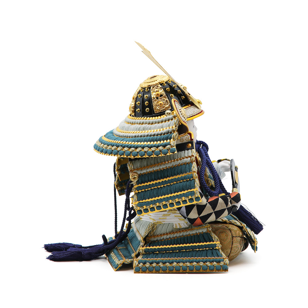 お人形に着せた鎧兜は正絹の威糸や紐を使用し、工房真の武者人形専用に熟練の職人が製作する小さいながらも本格的な国産鎧兜です。兜や鎧各所には鹿革で製作した白地の花柄の印伝。細長い鍬形に全体的にくすんだ色の縹色、水色の糸でまとめた威が爽やかで大変現代的な印象です。