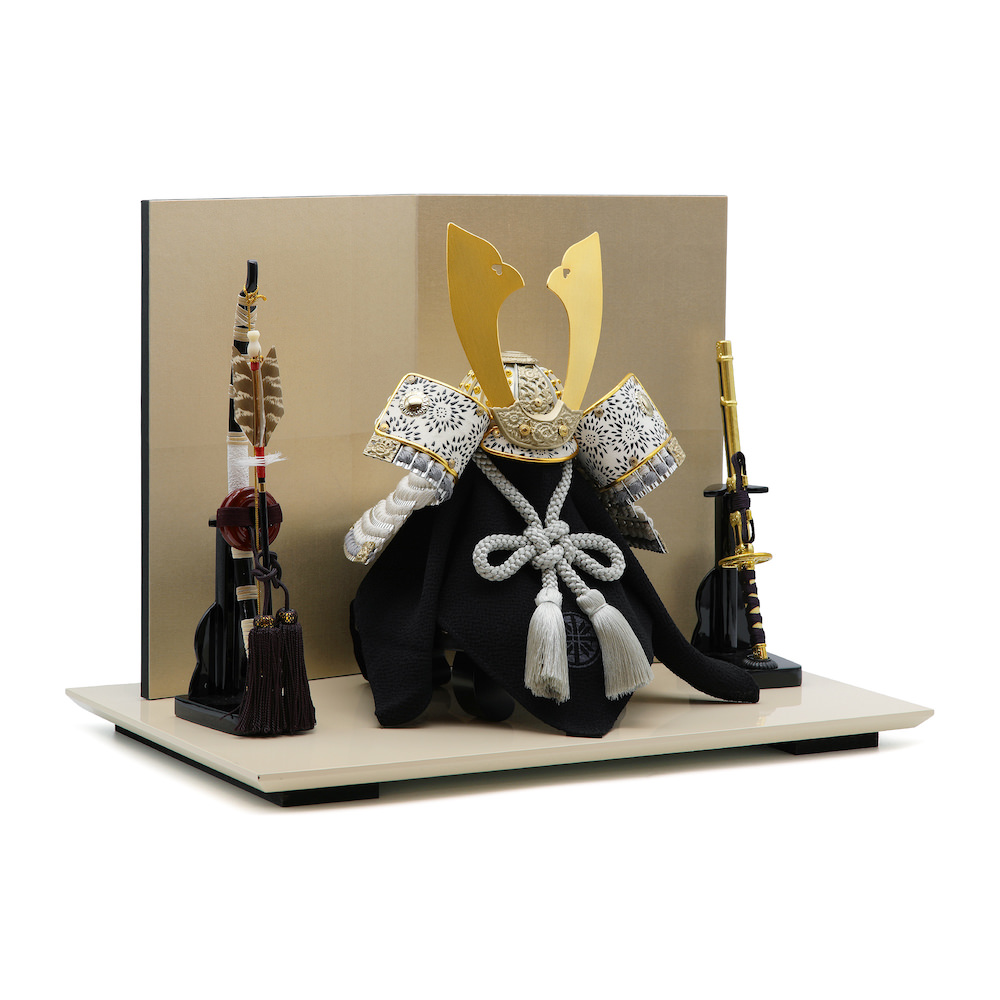 やわらかな印象の兜、屏風に厳格さのある伝統的な黒塗りの台と弓太刀を合わせて、モダンで温かみのある飾りにまとめました。