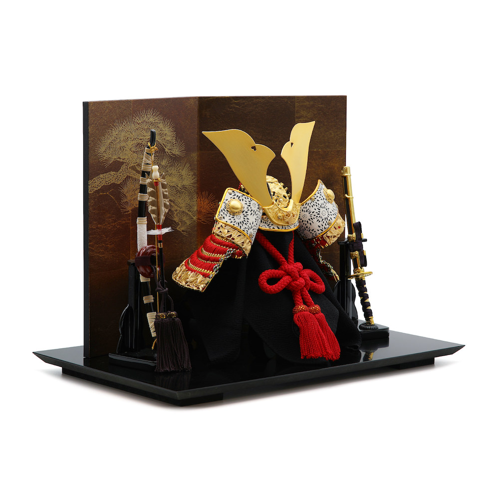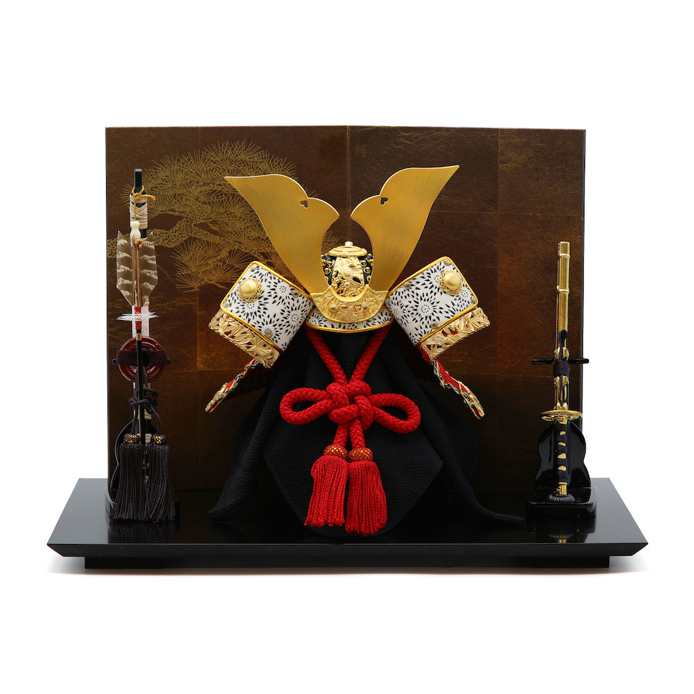 迫力のある兜に温かい色味の屏風を合わせることで、厳格な印象とモダンでやわらかな印象、どちらも感じることができるこだわりの兜飾りです。