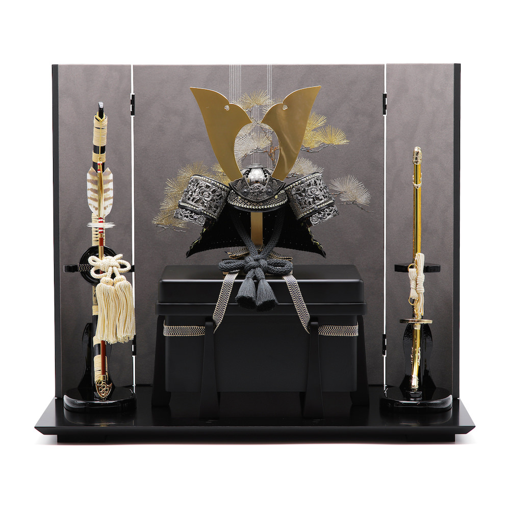 飾り台はシンプルな黒塗りの飾り台ですが、富山県高岡漆器の高岡塗りにて、敢えて艶(つや)をなくすことで、マットな質感を実現したお洒落な黒塗りの木製飾り台です。飾り台に乗せた黒色の櫃も飾り台と同様に、高岡塗り、光沢を可能な限りなくし、マットな落ち着いた雰囲気が特徴的な木製の品。シンプルながら兜飾りの存在感が際立つこだわりの逸品です。