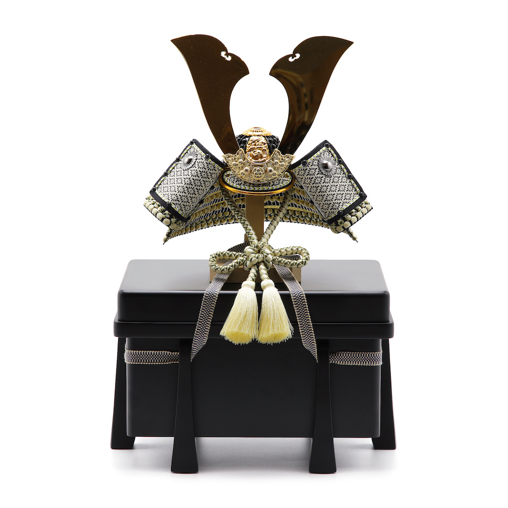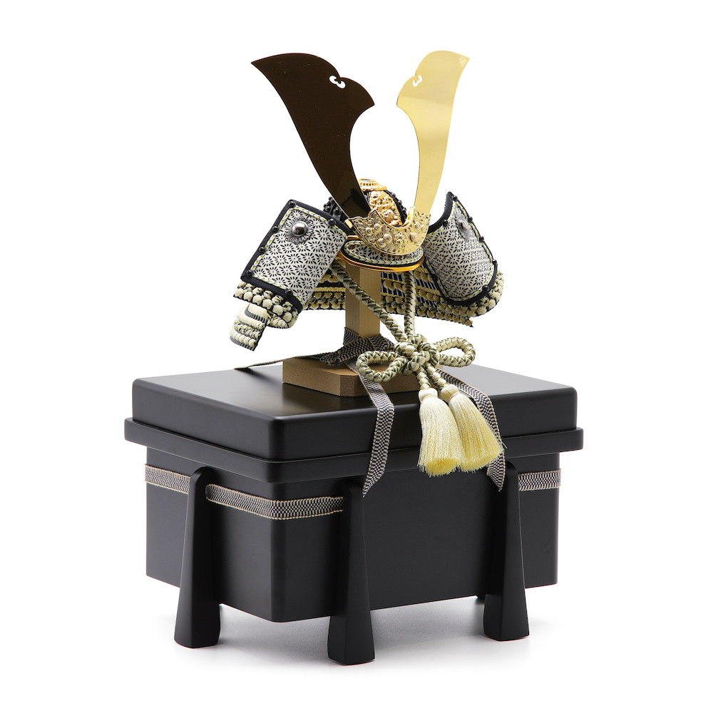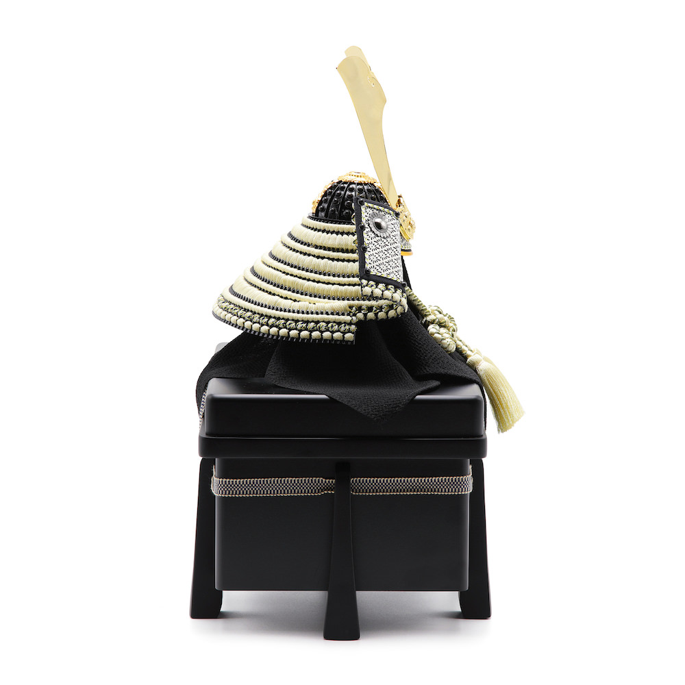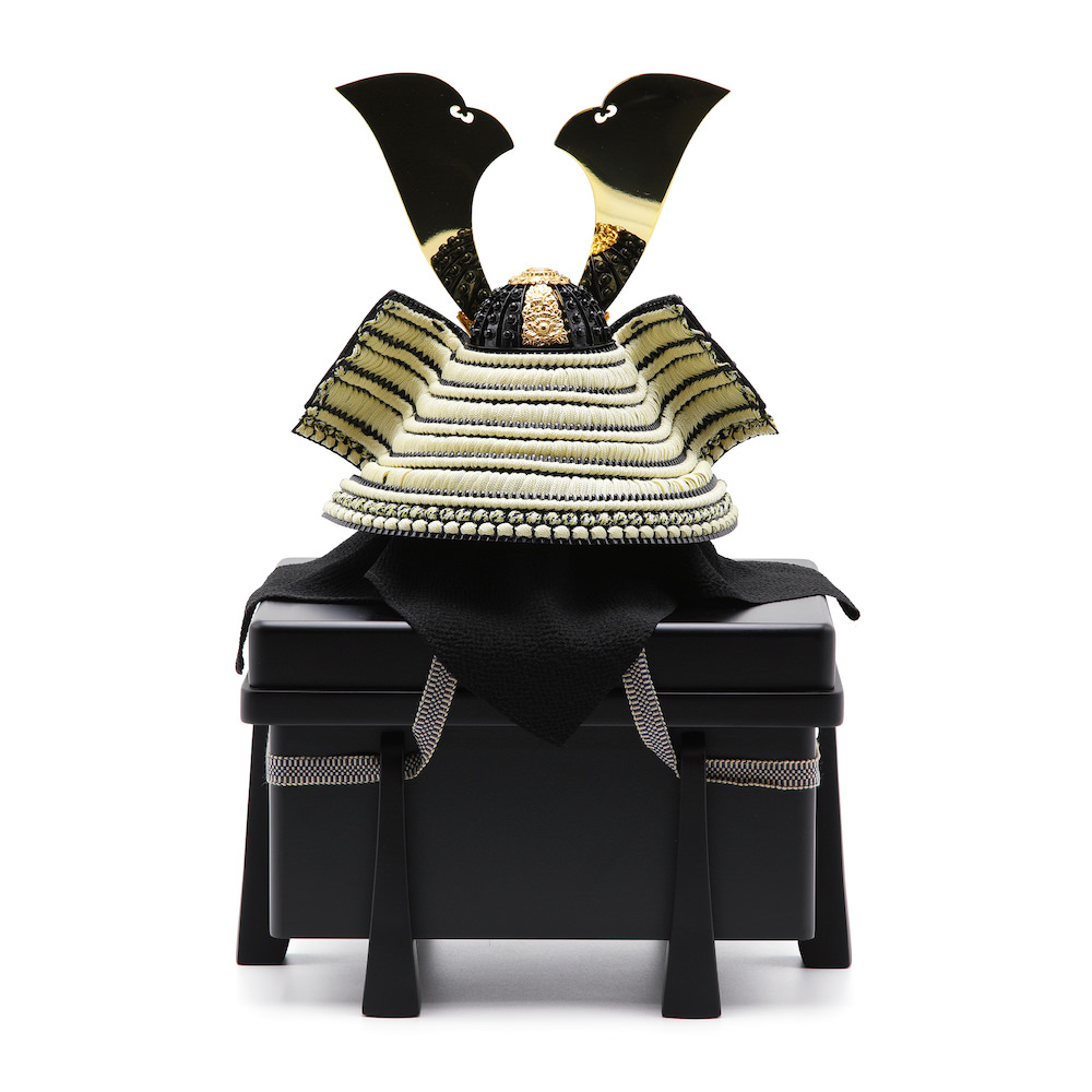 現代の住宅にも飾りやすく工房で企画したオリジナルの黒櫃は光沢を可能な限りなくし、マットな落ち着いた雰囲気が特徴的な木製の品。シンプルながら兜飾りの存在感が際立つこだわりの逸品です。