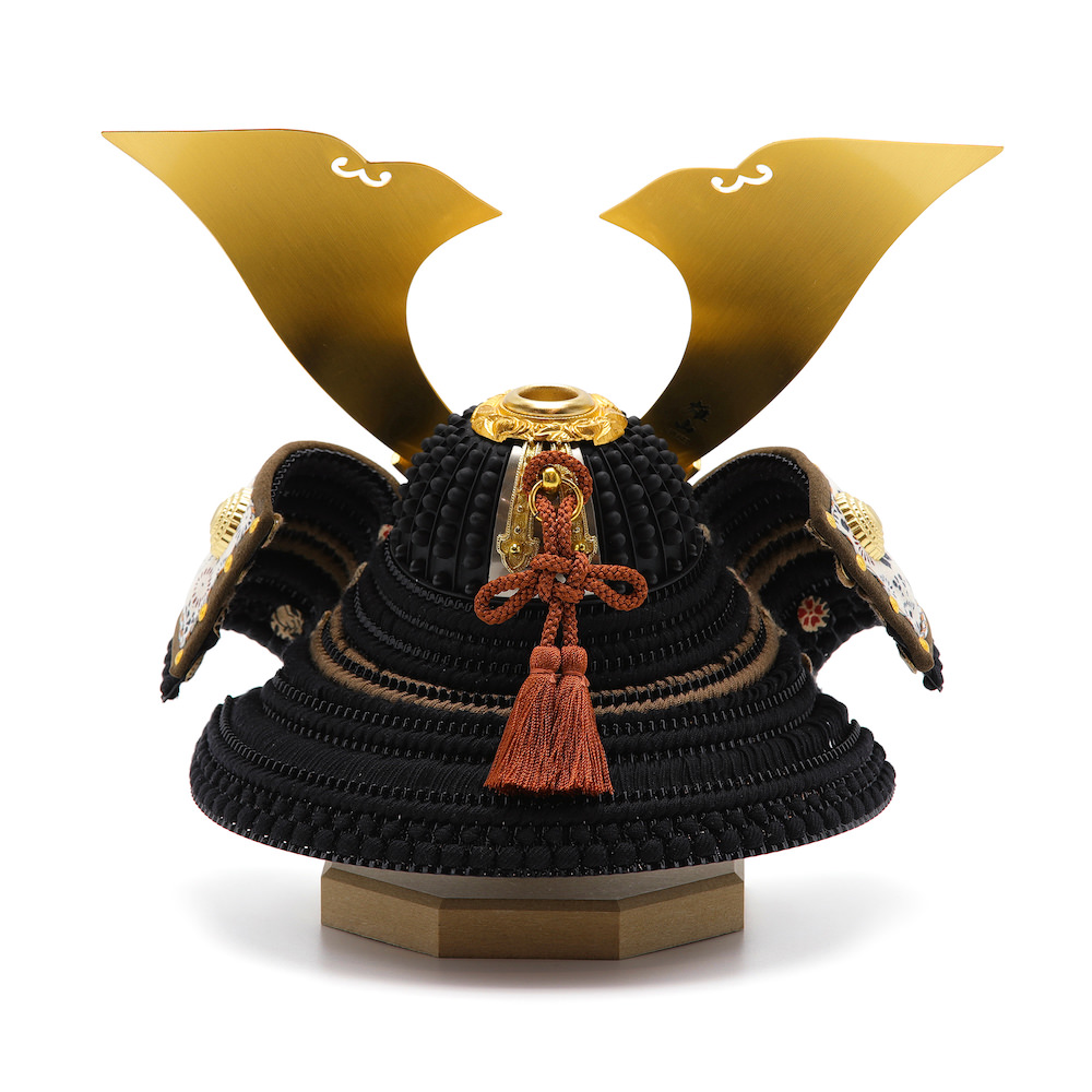 工房真と国内の甲冑師にて製作したこだわりの黒糸威の兜飾りです。威は名前の通り、黒色をメインに部分的に茶色を用いて、落ち着いた印象に仕上げています。鍬形は迫力ある大鍬形、純金メッキを使用した大変質の高い高価な品です。