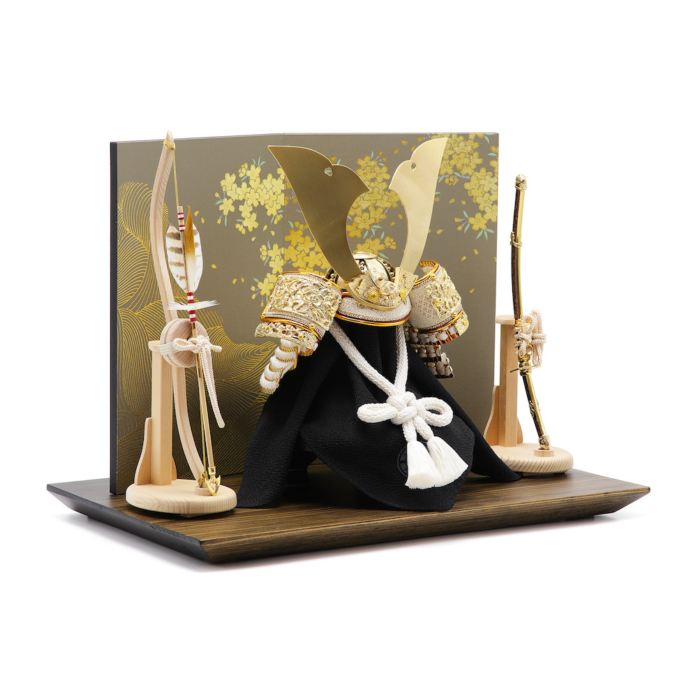 屏風はやや光沢のあるグレーの地に儚げな桜と白波が描かれた二曲屏風。落ち着いた美しさがあり、兜の存在が際立つモダンな品です。