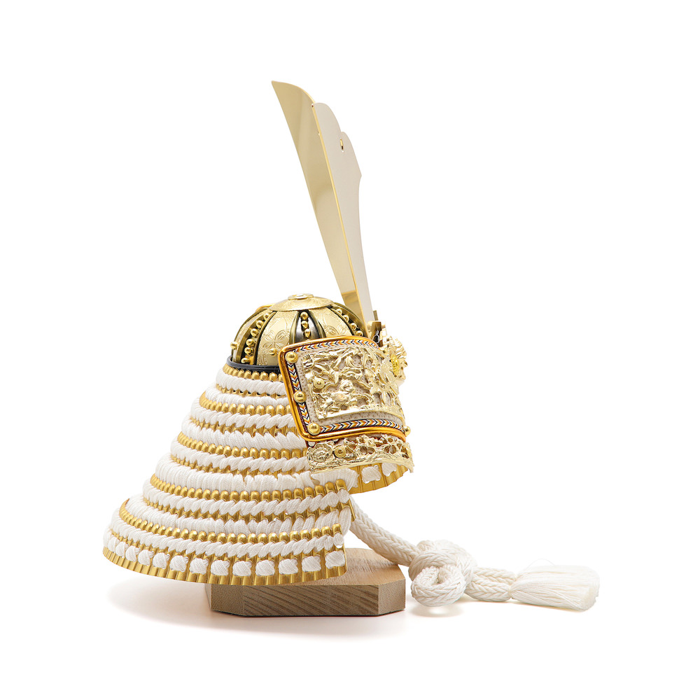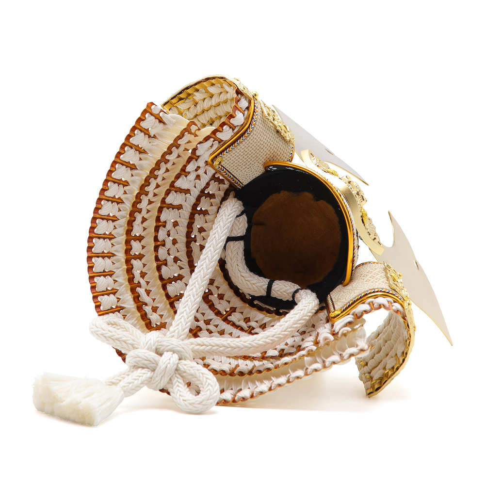 鍬形、鉢、鋲(びょう)、装飾金具、錣(しころ)も含め金色にて統一して製作しています。錣の裏側は本格的で高級と言われる白檀塗りを施しています。忍緒と威糸は白で統一。鉢は合わせ鉢と言われる実物の兜と同様に一枚一枚継いで作る伝統的な製造方法で製作しています。特に本兜の鉢は、現在ではあまり製作されることがない真鍮で製作しています。色づかいとしては、金と白の組み合わせが大変シンプルですが、素材の良さや妥協しない作りが滲み出てくるような存在感があります。