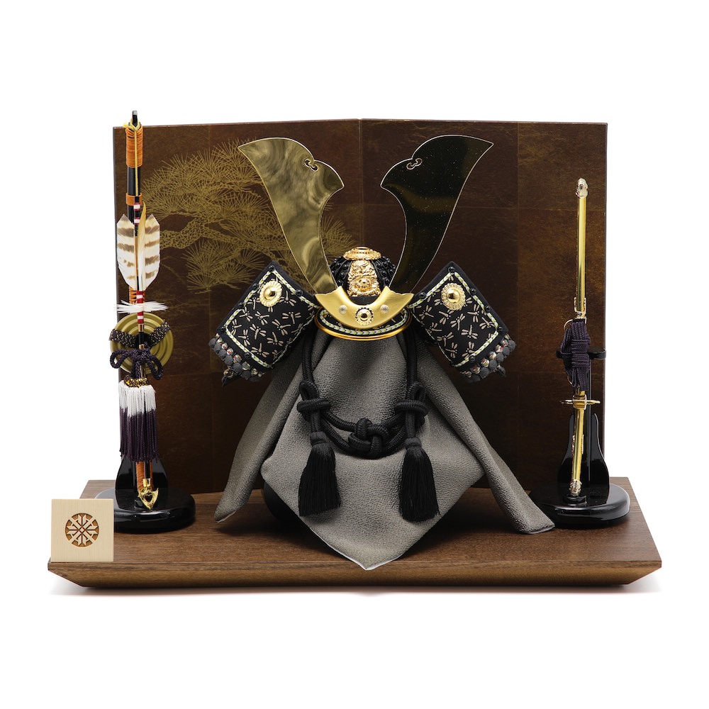 存在感のある兜を主役に茶系のお色でまとめた飾り台と屏風、お洒落な兜飾りに仕上がっています。