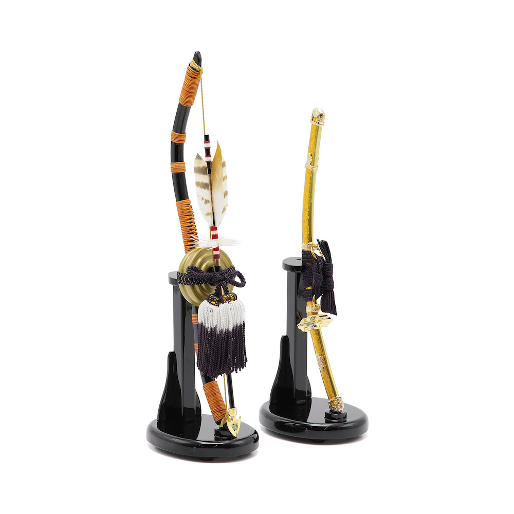 端午の節句らしい弓太刀は、黒塗りに橙色が差し色の工房真の兜向けに製作したオリジナルの品、国内最高峰の品質の品です。弓太刀には「魔除け」の意味、「社会が平穏であるように」という平和への願いが込められています。