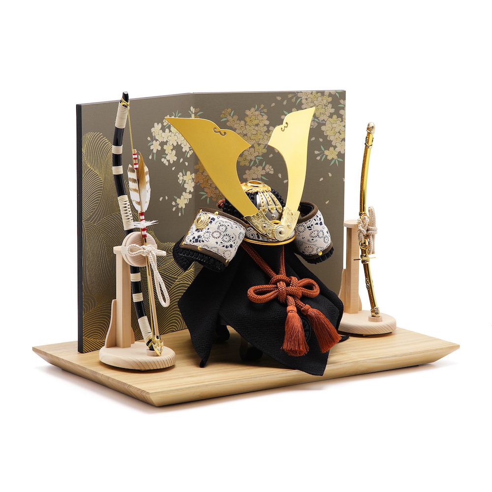 飾り台は、木目が美しいタモの木で製作したの国産飾り台。ナチュラルな雰囲気が魅力です。屏風はやや光沢のあるグレーの地に儚げな桜と白波が描かれた二曲屏風。落ち着いた美しさがあり、兜の存在が際立つモダンな品です。
