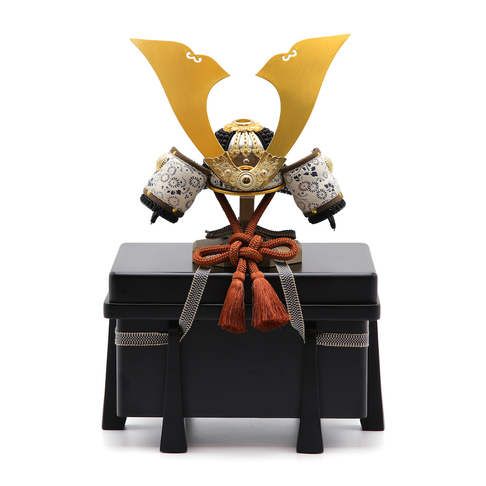 現代の住宅にも飾りやすく工房で企画したオリジナルの黒櫃は光沢を可能な限りなくし、マットな落ち着いた雰囲気が特徴的な木製の品。シンプルながら兜飾りの存在感が際立つこだわりの逸品です。