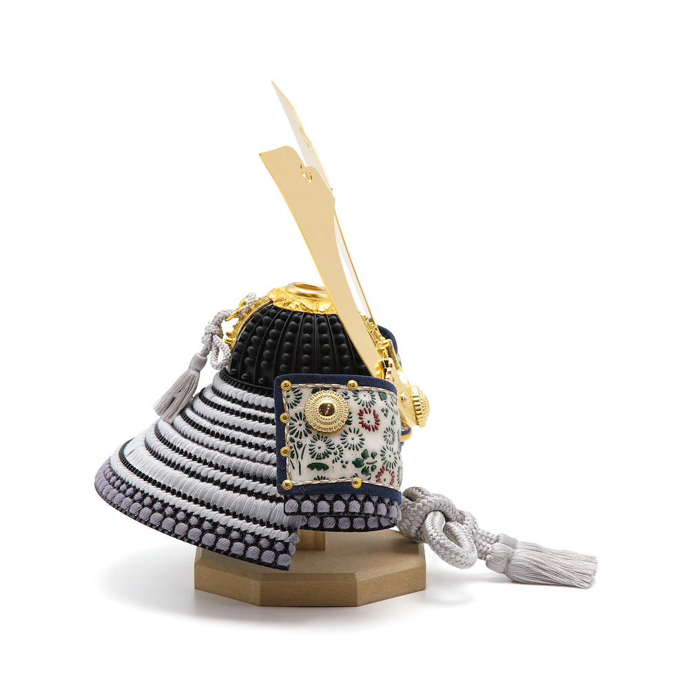現代のご自宅にも飾りやすいようコンパクトに国内の熟練甲冑職人と製作した兜は、コンパクトながらも現存する実際の多くの兜と同様の五段の錣(しころ)で製作するなど、通常のコンパクトサイズの兜とは異なる高い技術と手間を詰めた逸品です。 忍緒は威糸と同じ薄いグレー色を採用し、総角(あげまき)結びで仕上げています。特に威糸は大変細かい3mm間隔で編み込みを実施しており、五段錣兜の中でもクオリティとデザイン性含めて一線を画す、こだわりの品に仕上がっています。