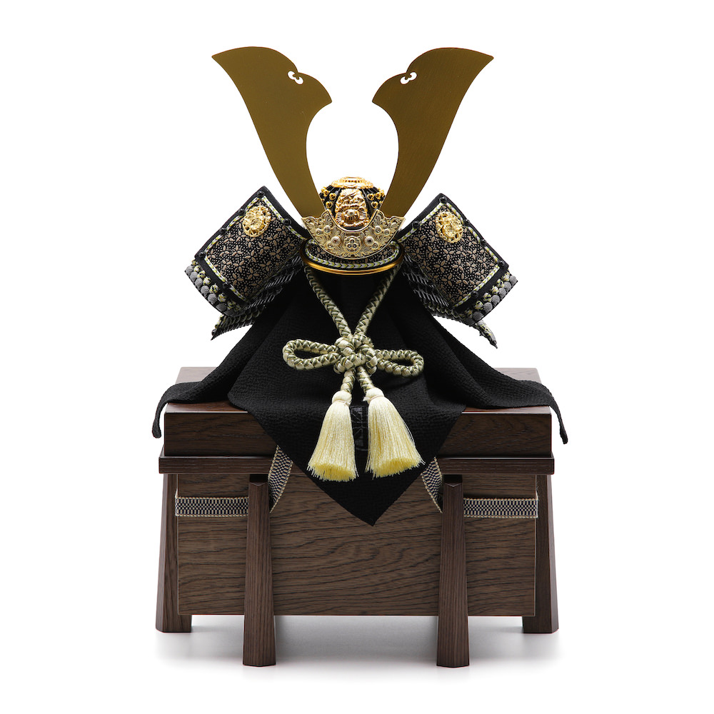 現代の住宅にも飾りやすく工房で企画したオリジナルの木製の櫃は木目のあたたかみとウォルナットの様な高級感と重厚感ある雰囲気が特徴的な木製の品。シンプルながら兜飾りの存在感が際立つこだわりの逸品です。