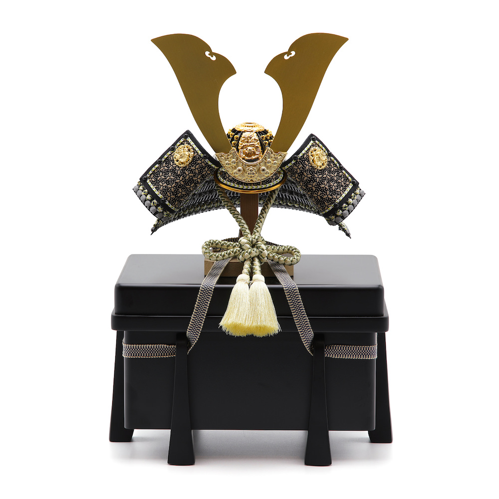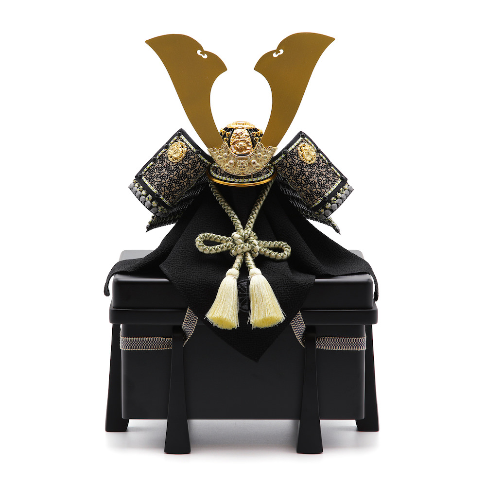 現代の住宅にも飾りやすく工房で企画したオリジナルの黒櫃は光沢を可能な限りなくし、マットな落ち着いた雰囲気が特徴的な木製の品。シンプルながら兜飾りの存在感が際立つこだわりの逸品です。