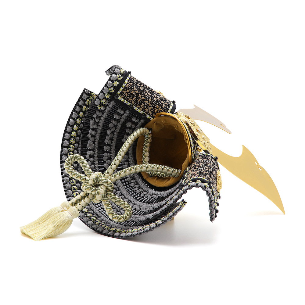 錣(しころ)は落ち着いた印象のシンプルな黒塗り、鉢は合わせ鉢と言われる実物の兜と同様に一枚一枚継いで作る伝統的な製造方法で製作しています。鉢、鍬形台、据文の装飾を邪気を払う神聖な花とされる菊の花で統一し、品のある兜に仕上げています。