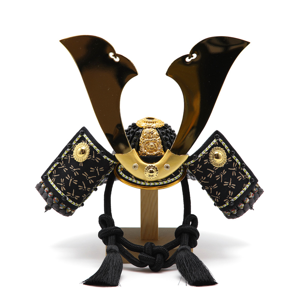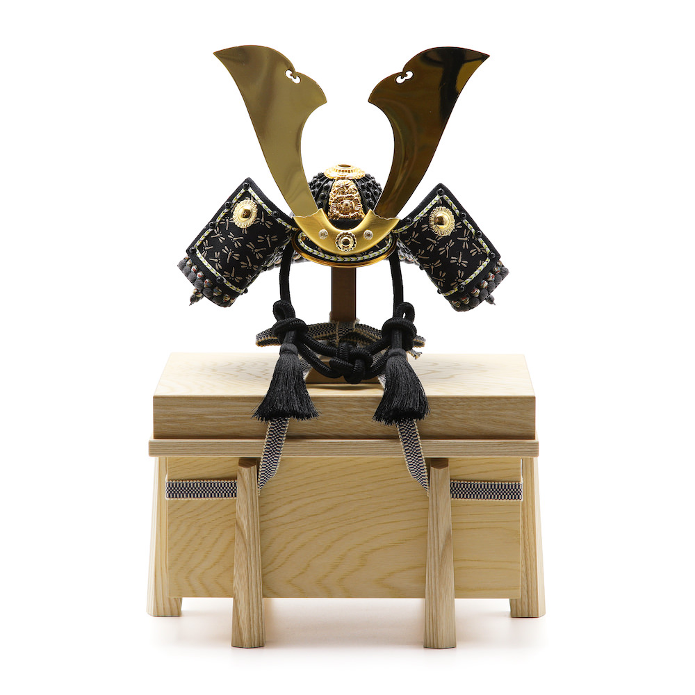 鏡のように輝く大きな鍬形、「勝ち虫」トンボの印伝の吹き返しが特徴の兜。古くから願いを叶えると言われる叶結びの忍緒もポイントです。栓の木で製作したナチュラルなお色の木製のお櫃に兜をセットしました。兜はお櫃の中に収納することが可能となるため、洗練されたスタイリッシュさと機能性を兼ね備えています。