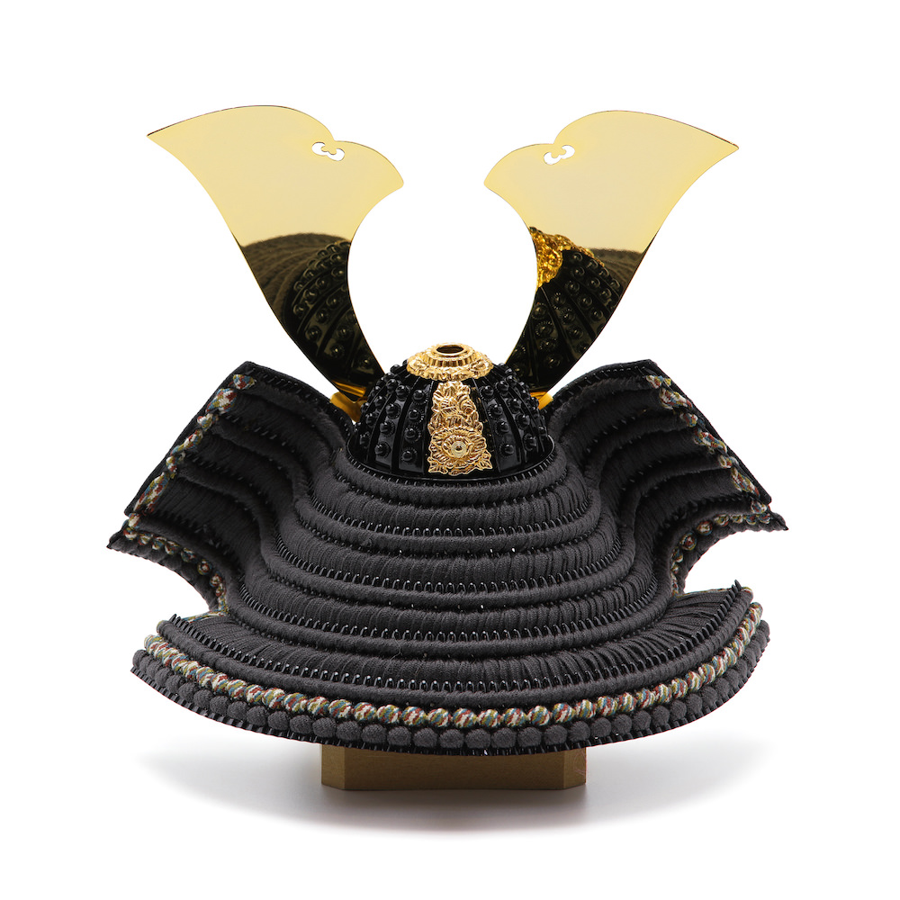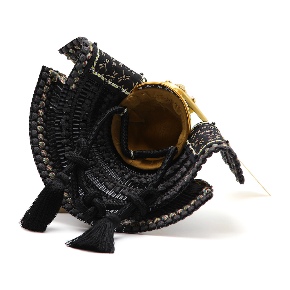 錣(しころ)は落ち着いた印象のシンプルな黒塗り、鉢は合わせ鉢と言われる実物の兜と同様に一枚一枚継いで作る伝統的な製造方法で製作しています。金の装飾以外鋲を含め黒で統一し、すっきりとした印象に仕上げました。吹き返し、鉢、鍬形台、据文の装飾は邪気を払う神聖な花とされる菊の花で統一し、品のある兜に仕上げています。