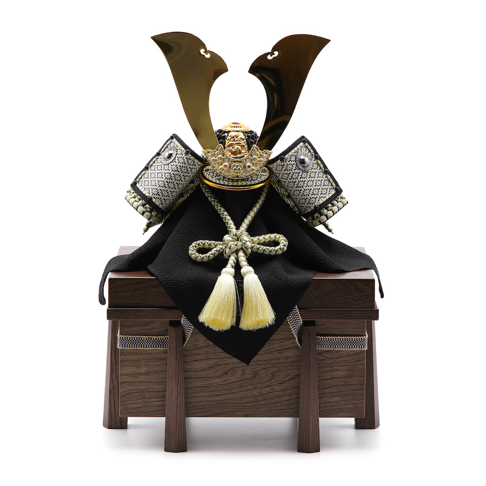 現代の住宅にも飾りやすく工房で企画したオリジナルの木製の櫃は木目のあたたかみとウォルナットの様な高級感と重厚感ある雰囲気が特徴的な木製の品。シンプルながら兜飾りの存在感が際立つこだわりの逸品です。