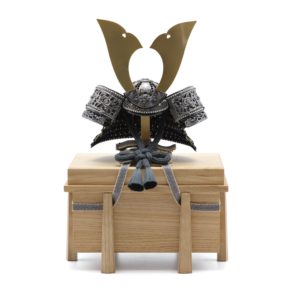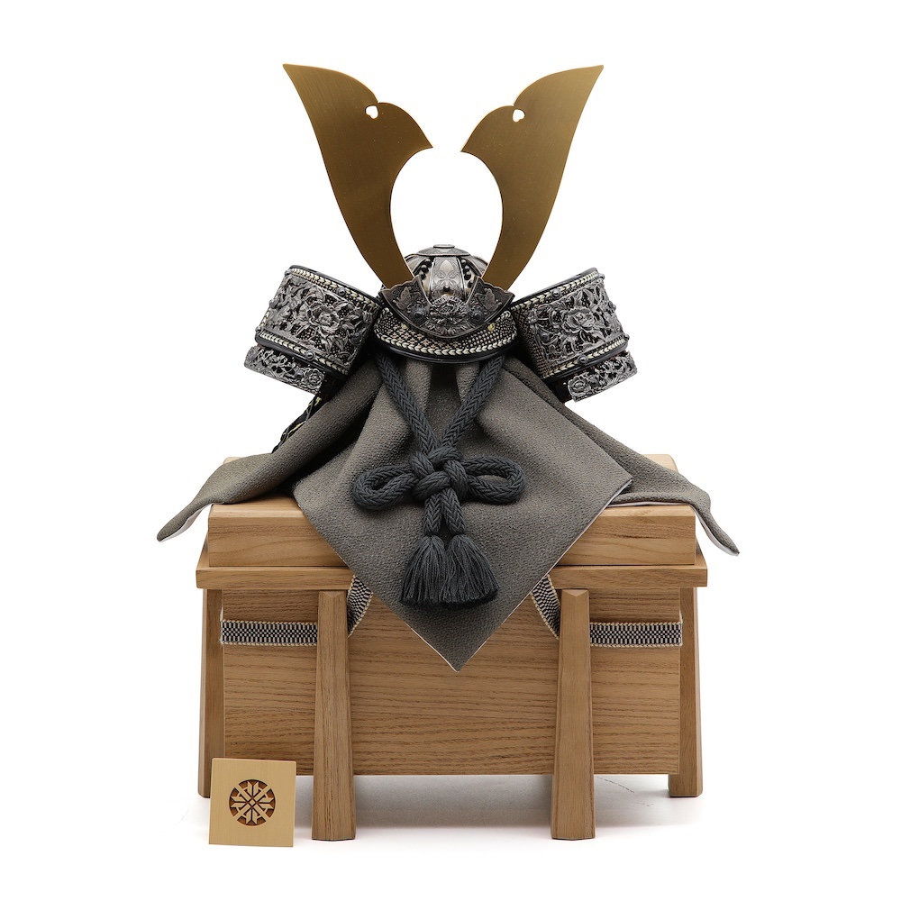 大きな鍬形、豪華な獅子牡丹の装飾の兜。鉢は現在では希少な真鍮で製作したこだわりの兜です。威糸は黒、忍緒は黒に近いくすんだグレーの墨色。どっしりとした男らしい兜に仕上げています。シンプルな木目の桐製の櫃にセットした飾りです。兜はお櫃の中に収納することが可能となるため、洗練されたスタイリッシュさと機能性を兼ね備えています。