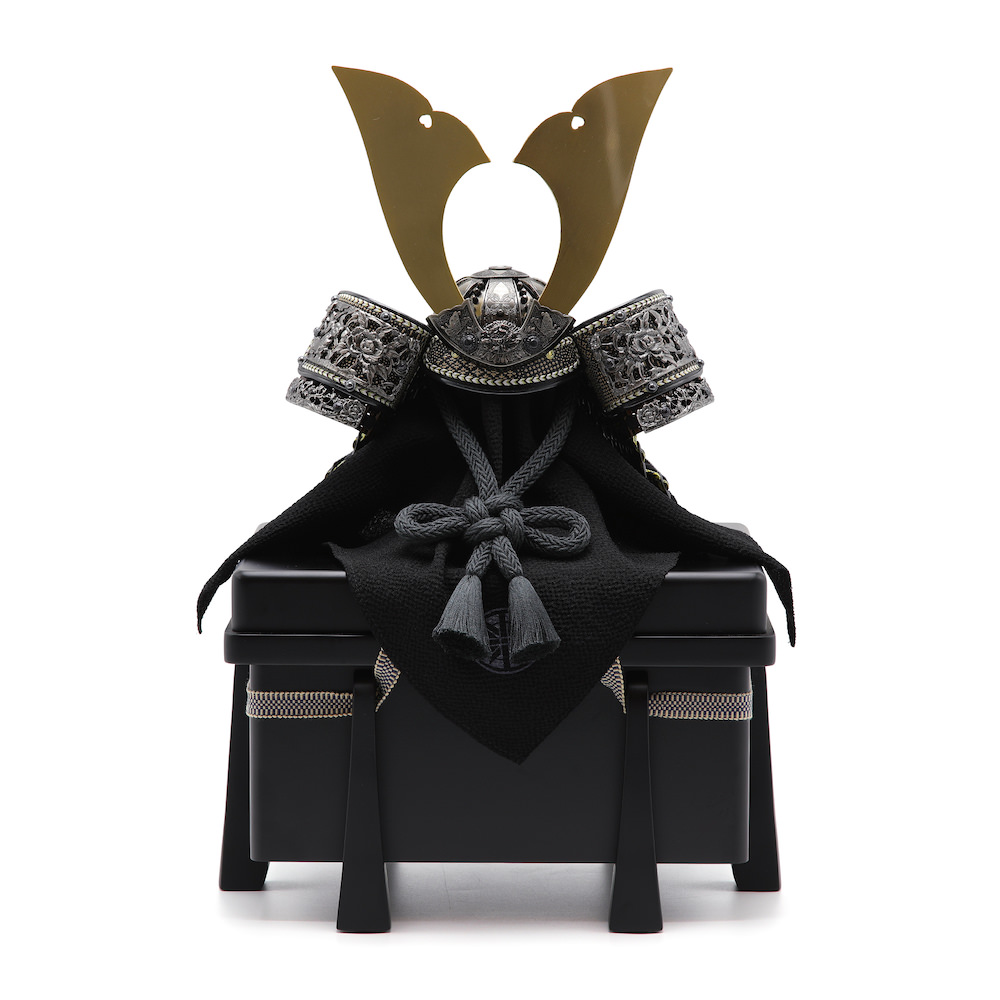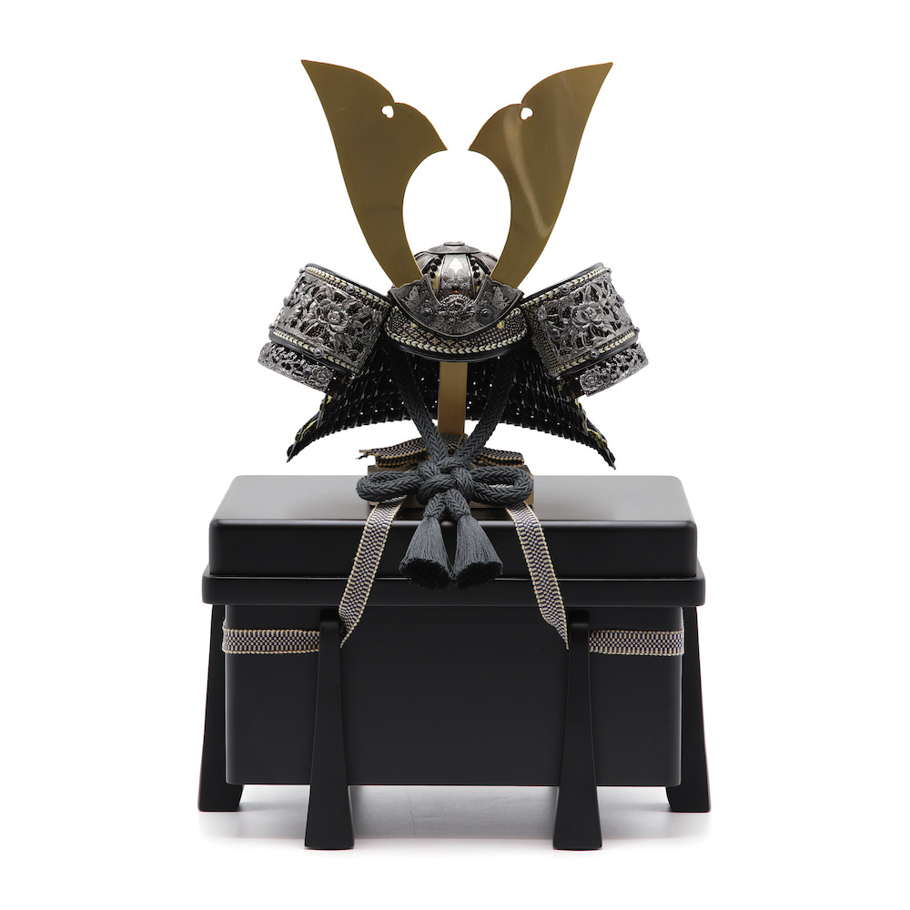 現代の住宅にも飾りやすく工房で企画したオリジナルの黒櫃は光沢を可能な限りなくし、マットな落ち着いた雰囲気が特徴的な木製の品。シンプルながら兜飾りの存在感が際立つこだわりの逸品です。