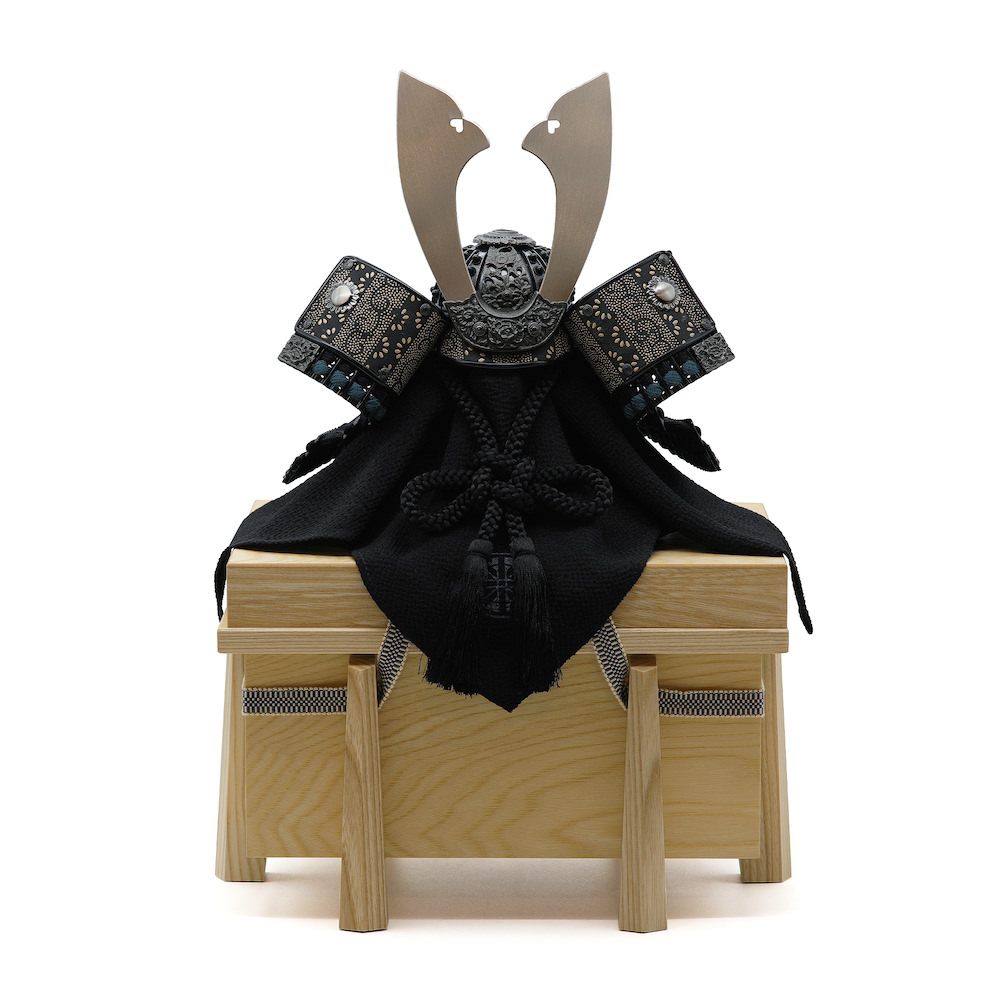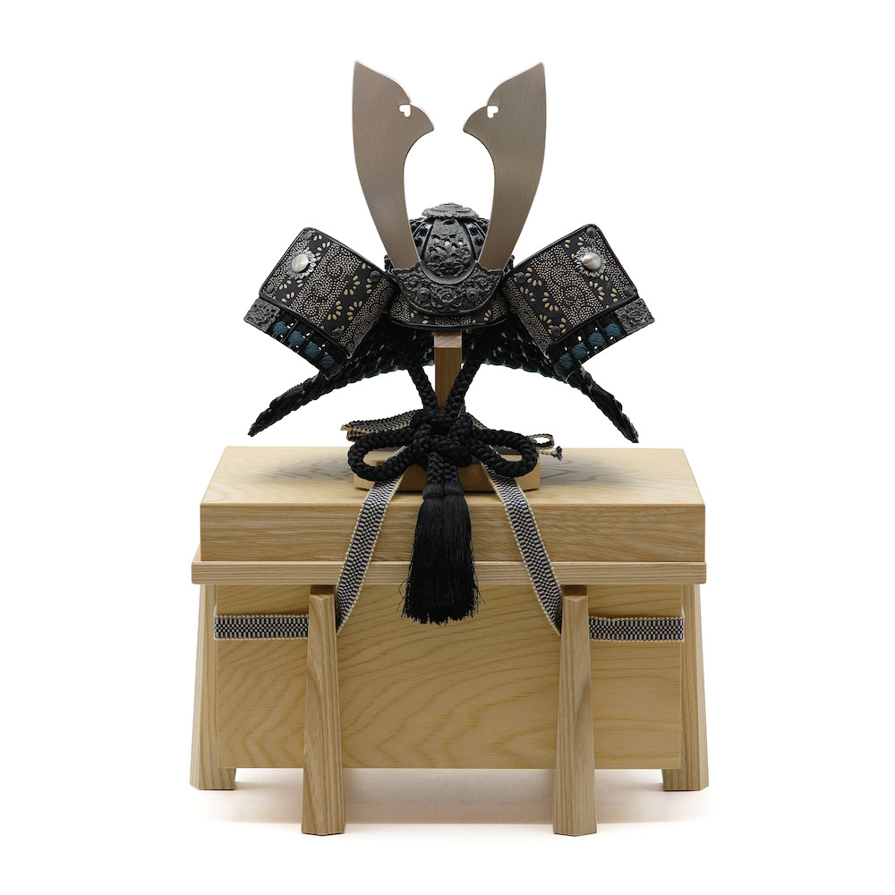 黒を中心にシックにまとめた兜。鉢、威糸、忍緒など全体的な黒に一部グレーの威糸、縹色の耳糸でアクセントを加えた存在感のある兜です。栓の木で製作したナチュラルなお色の木製のお櫃に兜をセットしました。兜はお櫃の中に収納することが可能となるため、洗練されたスタイリッシュさと機能性を兼ね備えています。