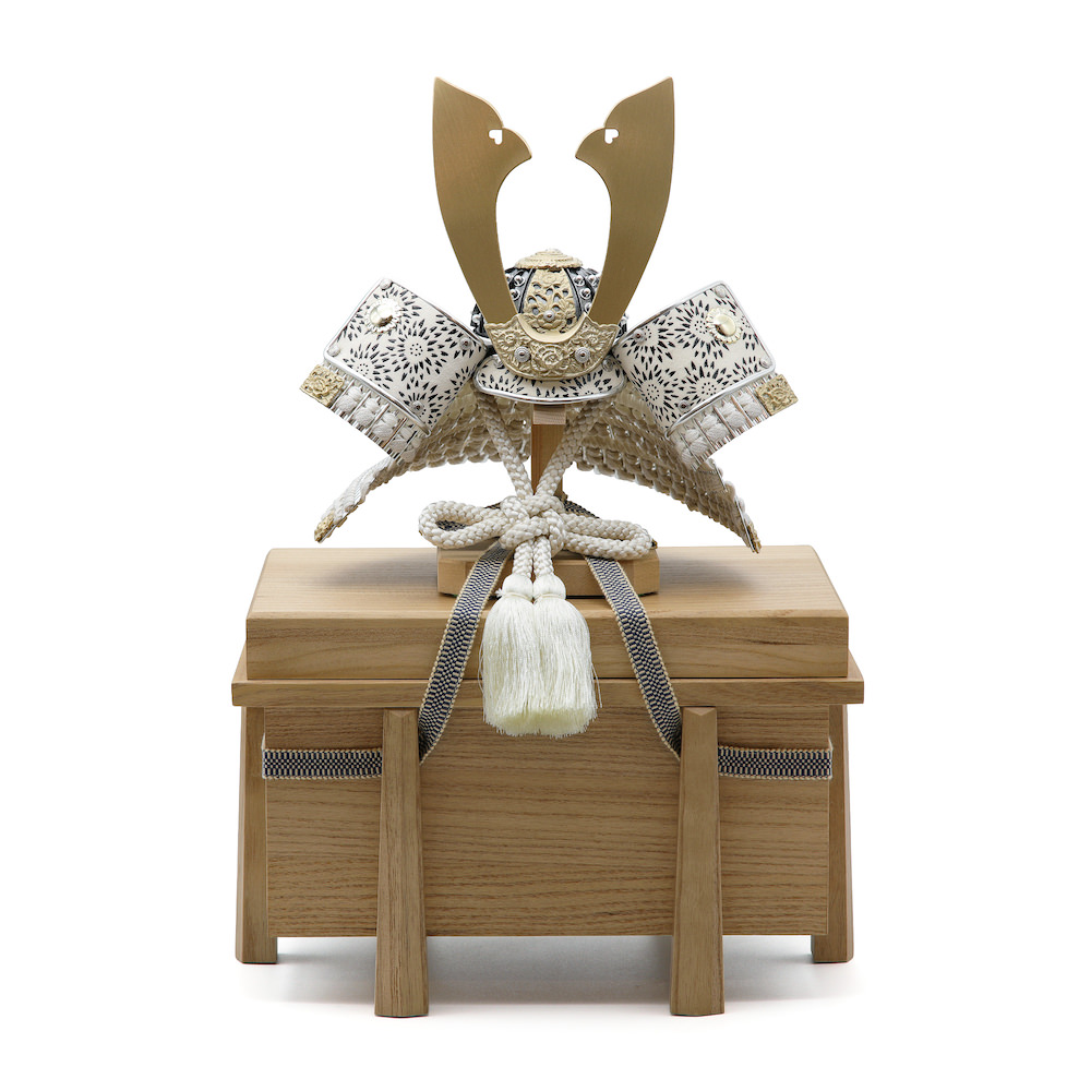 爽やかで現代的な印象の白い兜。威糸は白、錣は銀、鍬形と鉢の装飾は上品なシャンパンゴールドを合わせて明るくモダンな印象にまとめました。シンプルな木目の桐製の櫃にセットした飾りです。兜はお櫃の中に収納することが可能となるため、洗練されたスタイリッシュさと機能性を兼ね備えています。