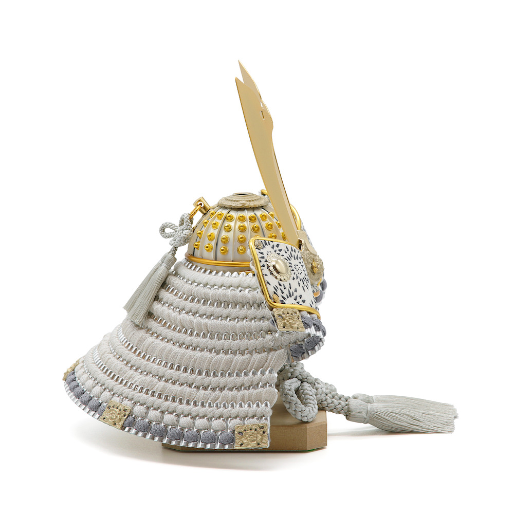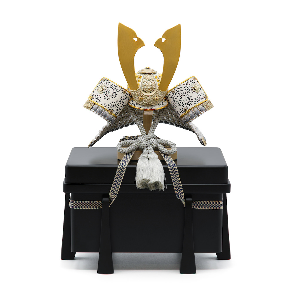 やわらかで現代的な印象の薄いグレーを基調にした兜。威糸は白と薄いグレー、錣は銀、鍬形と鉢の装飾は金と上品なシャンパンゴールドを合わせてまとめました。シンプルな黒塗りの櫃は、敢えて艶を少なめにしたマットな質感がお洒落な品です。兜はお櫃の中に収納することが可能となるため、洗練されたスタイリッシュさと機能性を兼ね備えています。