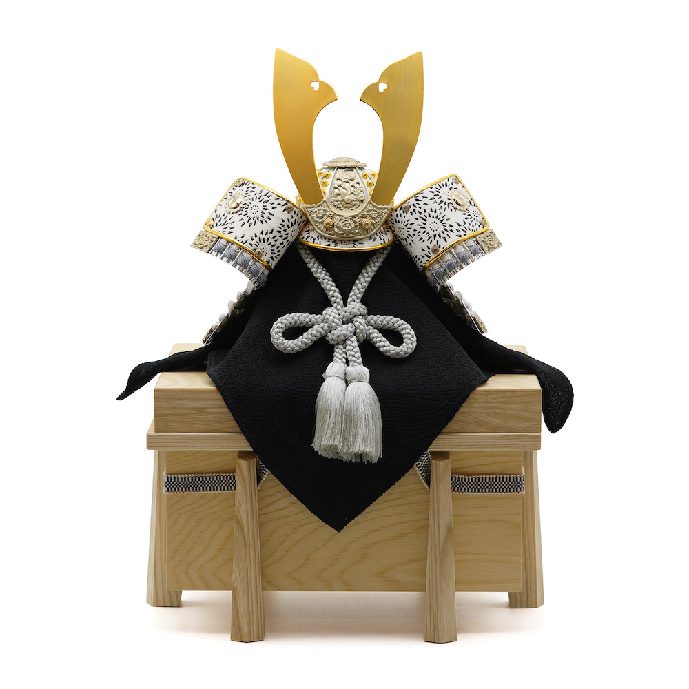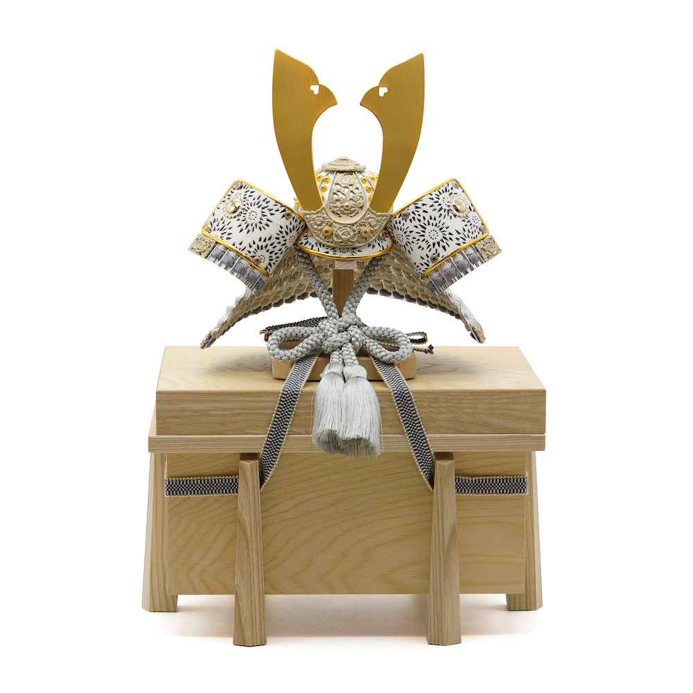 やわらかで現代的な印象の薄いグレーを基調にした兜。威糸は白と薄いグレー、錣は銀、鍬形と鉢の装飾は金と上品なシャンパンゴールドを合わせてまとめました。栓の木で製作したナチュラルなお色の木製のお櫃に兜をセットしました。兜はお櫃の中に収納することが可能となるため、洗練されたスタイリッシュさと機能性を兼ね備えています。
