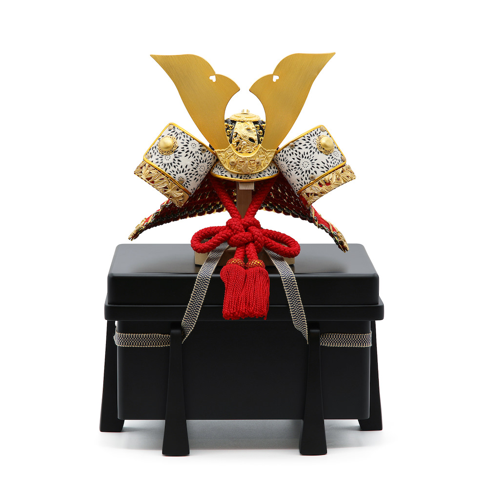 迫力ある大きな鍬形に赤の威糸の兜。竹と雀が描かれた豪華な装飾金具が特徴的な竹雀の兜です。奈良県の春日大社に現存する国宝の竹雀を参考にアレンジしたこだわりの品です。シンプルな黒塗りの櫃は、敢えて艶を少なめにしたマットな質感がお洒落な品です。兜はお櫃の中に収納することが可能となるため、洗練されたスタイリッシュさと機能性を兼ね備えています。