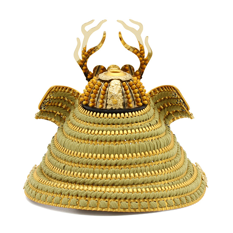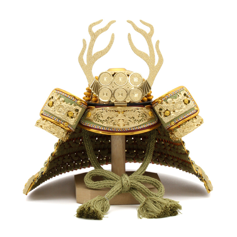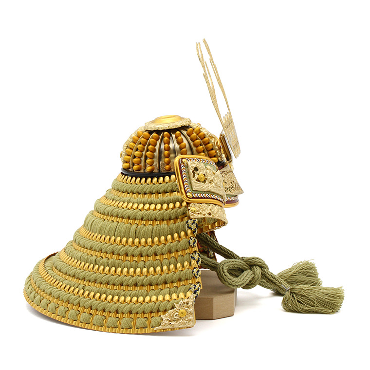 特徴的な六文銭の兜は「日本一の兵(ひのもといちのつわもの)」と評された勇猛果敢な真田幸村公の兜を模して製作しています。数々の武功を上げた強く勇敢な武将です。薄鶯色の威も趣深く、大変魅力的です。