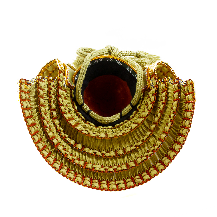 鉢は合わせ鉢と言われる実物の兜と同様に一枚一枚継いで作る伝統的な製造方法で製作しています。現代のご自宅にも飾りやすいようコンパクトに国内の熟練甲冑職人と製作しました。コンパクトながらも実際の多くの兜と同様の五段の錣(しころ)など、高い技術と手間を詰めた逸品です。