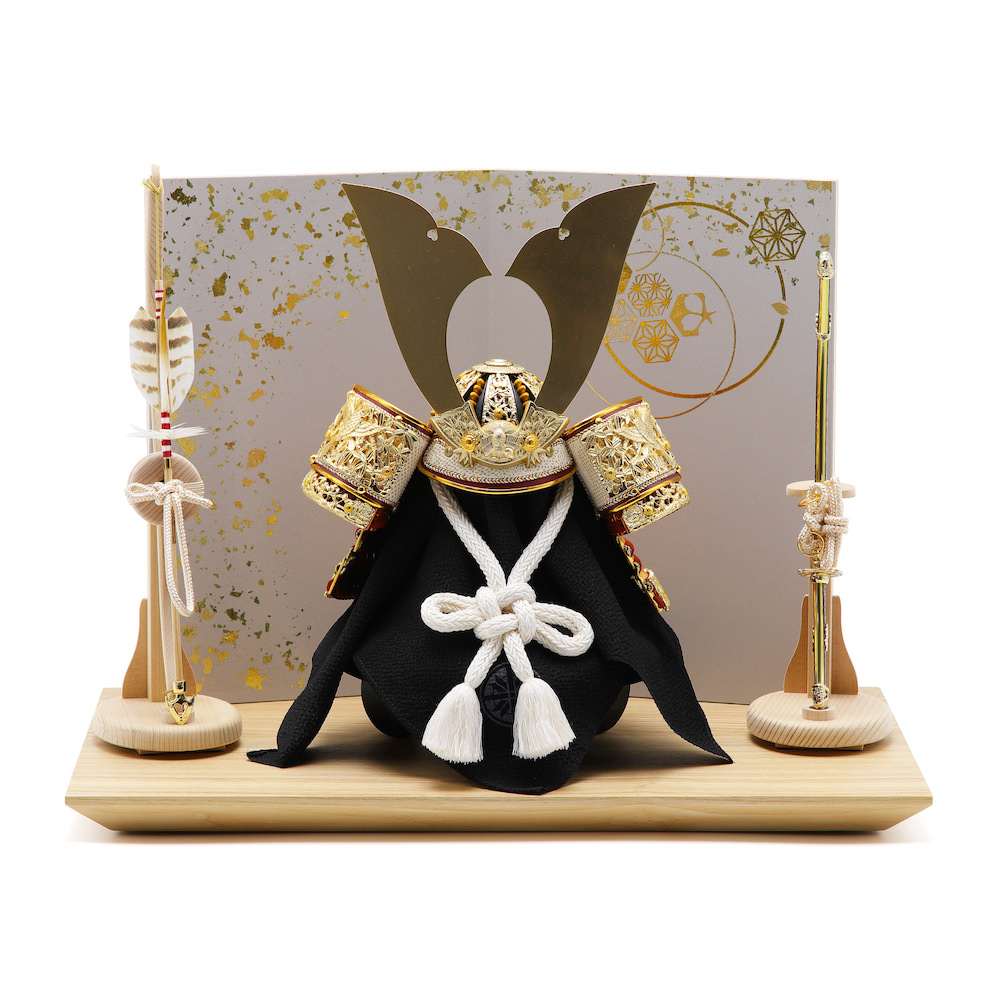 飾り台、屏風、弓太刀のモダンな雰囲気から益々兜の豪華さが引き立つ逸品です。