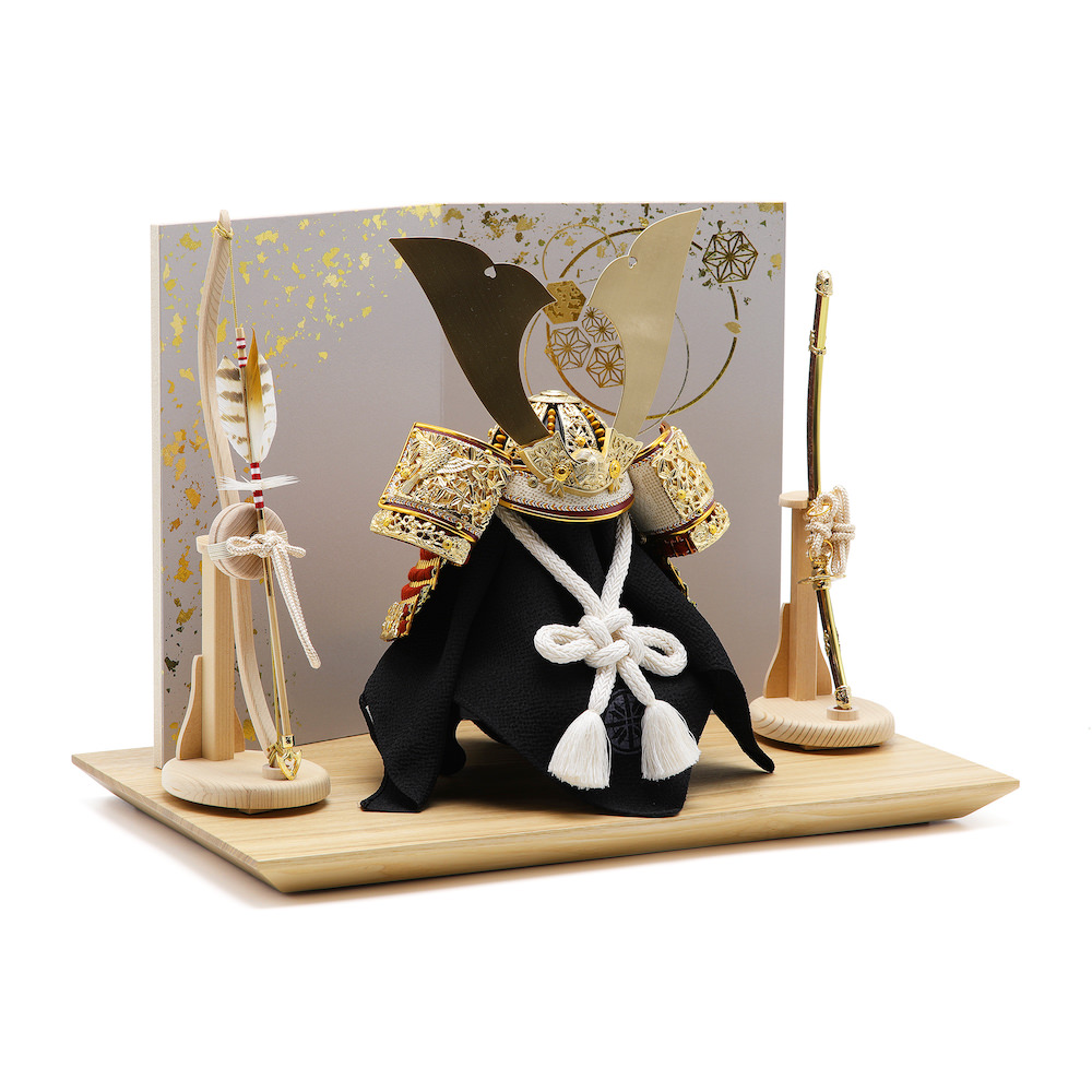兜の両隣には端午の節句らしく、男らしい国産の弓太刀を添えています。爽やかでモダンな白木で製作した品です。弓太刀には「魔除け」の意味、「社会が平穏であるように」という平和への願いが込められています。