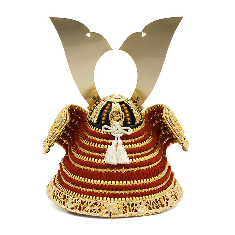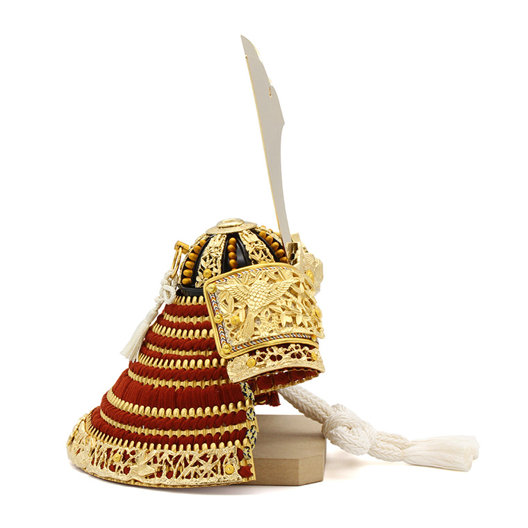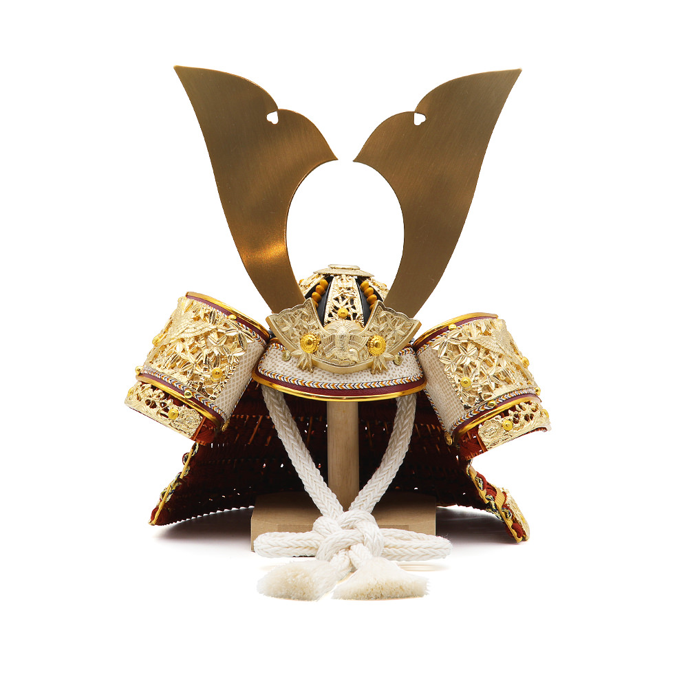 奈良県春日大社の国宝、竹雀の兜を、一流の職人の技術で再現しました。細部までこだわった本格的な手づくり品です。吹返や鍬形台などの名前の通りの竹と雀の金の装飾は大変豪華で、赤い威に白を織り交ぜたお色が伝統的ながらモダンな印象を与えてくれる美しい品です。