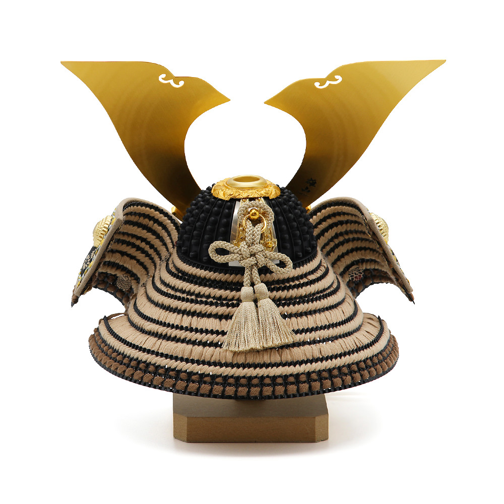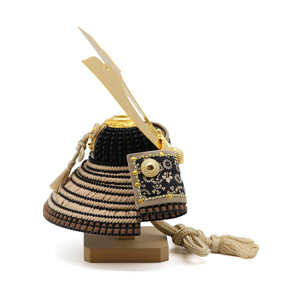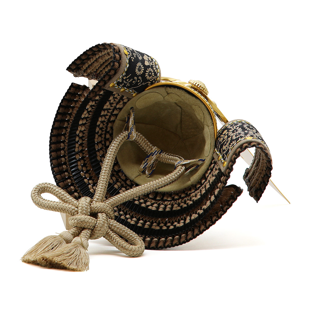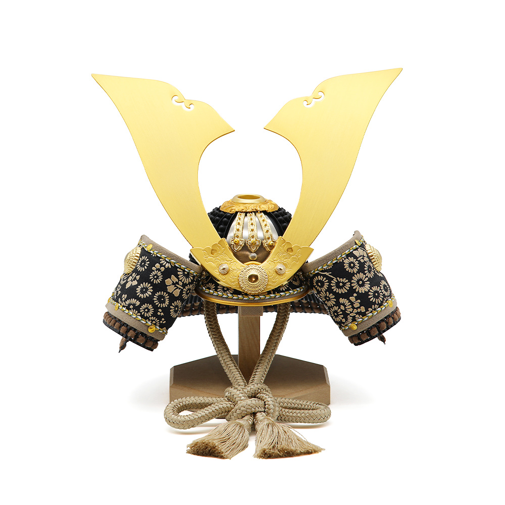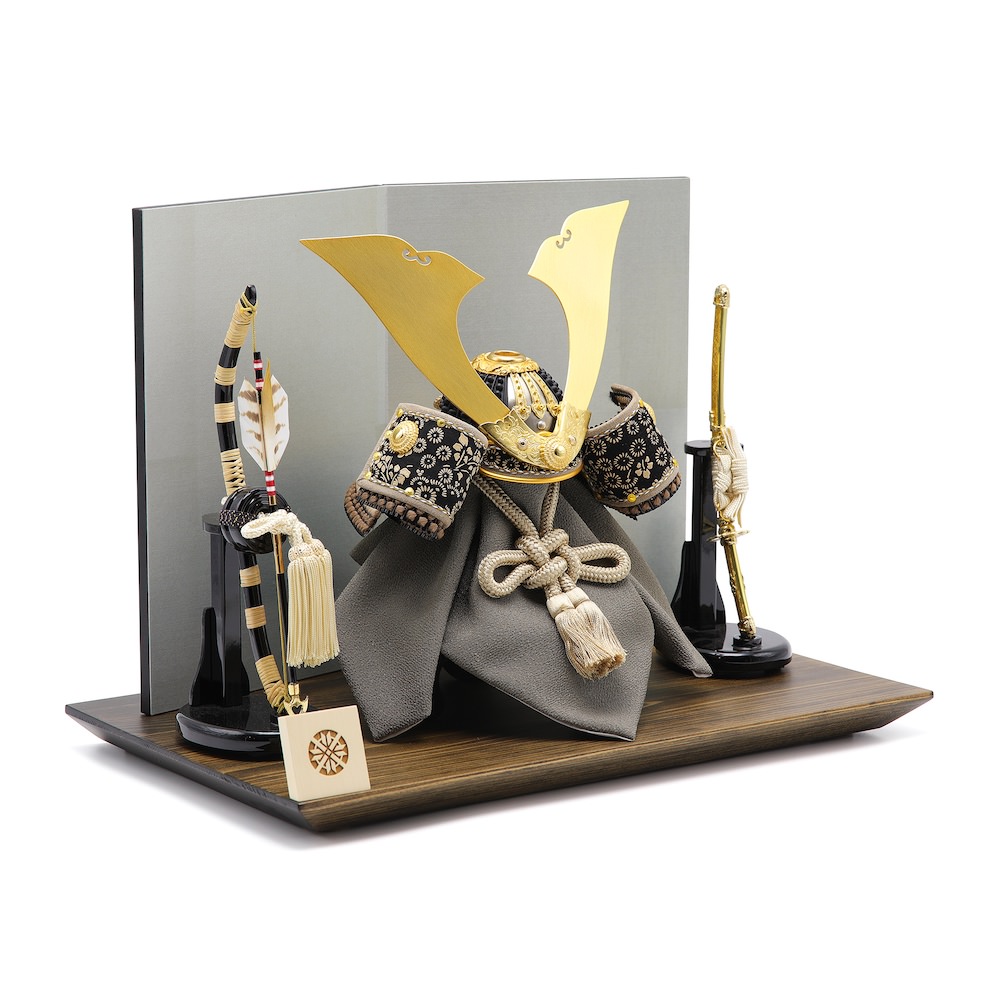 飾り台は、高岡漆器の高岡で製作した木目を活かし、漆を使って拭き漆の技法で仕上げたこだわりの国産飾り台。屏風は、現代的な銀色とごく薄い青の中間色のような光沢ある屏風。静岡県にて製作したこだわりの品です。兜の両隣には端午の節句らしく、男らしい国産の弓太刀を添えています。房や紐をベージュ色で製作した気品のある国内最高峰の品質の品です。弓太刀には「魔除け」の意味、「社会が平穏であるように」という平和への願いが込められています。拭き漆飾り台の厳かな雰囲気と屏風、弓太刀のモダンな雰囲気から上品でありつつも、新しさを感じる飾りに仕上がっています。