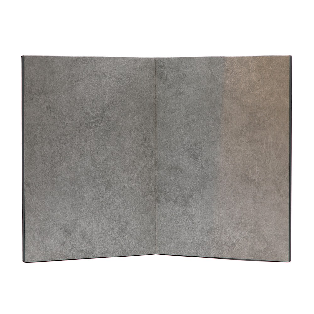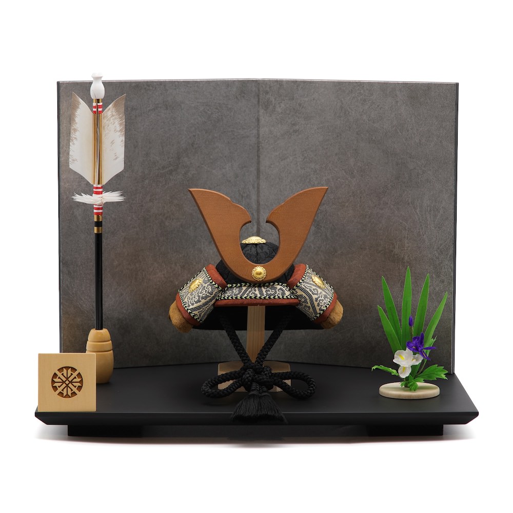 飾り台に合わせた屏風は、兜と飾り台に合わせて用意した特別な品。黒と銀の中間色、ざらっとした質感が特徴的な荒振り屏風。静岡県にて製作したこだわりの品です。一枚一枚手作業で配置していることから独特の美しさと屏風ごとの若干の個体差がございます。