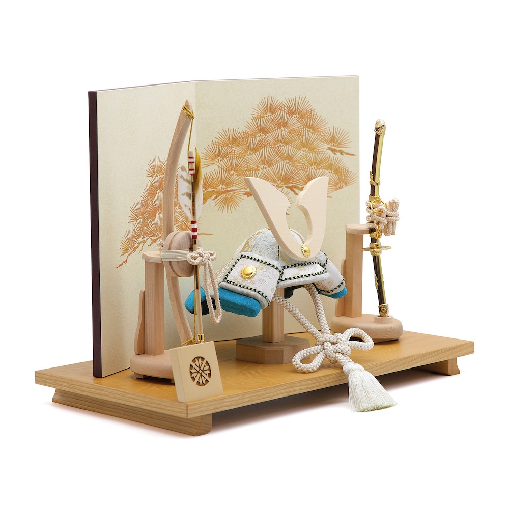 端午の節句らしい弓太刀は、兜や飾り台に合わせて白木で製作した洗練された品、国内最高峰の品質の品です。弓太刀には「魔除け」の意味、「社会が平穏であるように」という平和への願いが込められています。