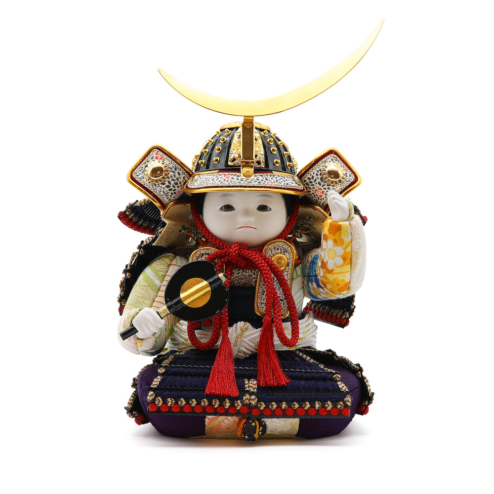 屏風は、現代的な銀色とごく薄い青の中間色のような光沢ある屏風。静岡県にて製作したこだわりの品で、天然繊維である生糸から作られた箔押し紙を利用し、一枚一枚手作業で配置していることから独特の美しさと屏風ごとの若干の個体差がございます。小物として端午の節句らしくシンプルな菖蒲の花を添えました。勇ましさと可愛らしさどちらも感じる工房こだわりの武者人形飾りです。
