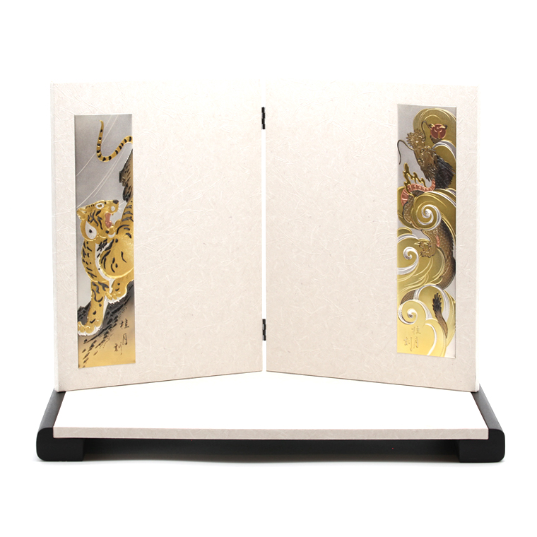 飾り台は白い国産の木製飾り台、屏風には龍と虎が描かれた爽やかさと強さを感じるこだわりの品です。端午の節句らしい鯉のぼりと菖蒲の花を添えました。勇ましさと可愛らしさどちらも感じる工房こだわりの武者人形飾りです。 また、当社お人形を購入いただいたお客様には、全て桐箱をお付けしています。兜木目込武者人形及び、鎧兜木目込武者人形につきましては、兜専用の小さい桐箱もお付けしています。 ※木目込武者人形については、桐箱は一つのみとなります。 末長く大切に保管いただけるよう工房真の武者人形専用に国内で製作したこだわりの桐箱です。
