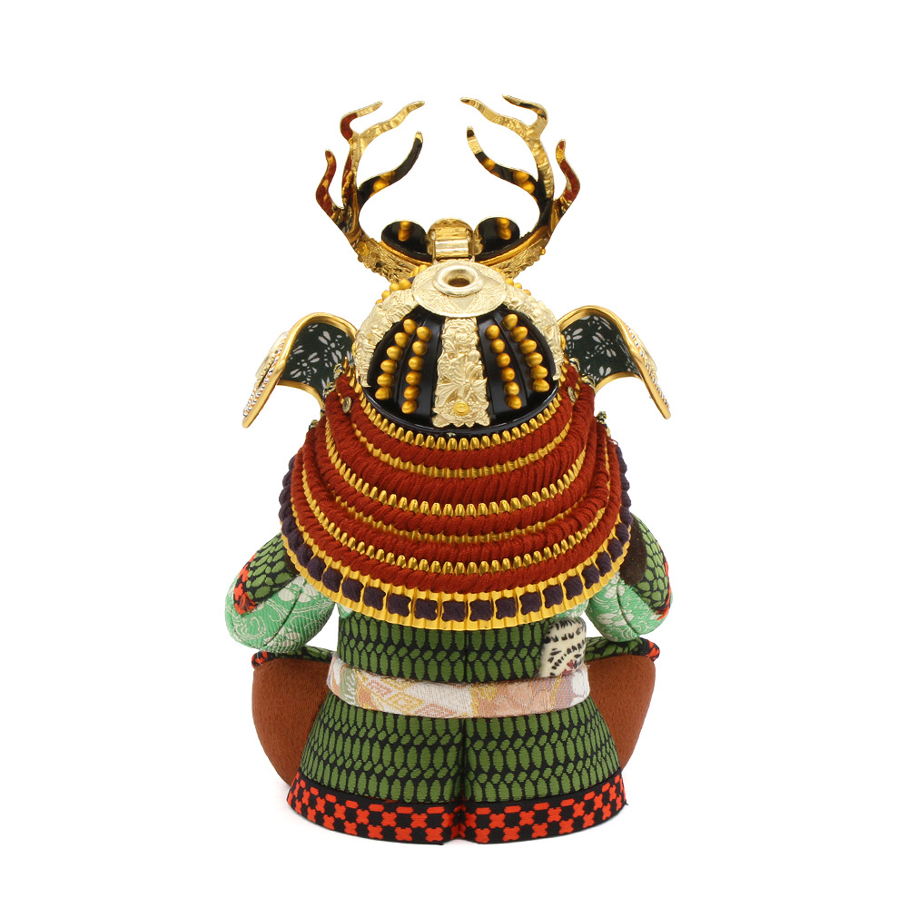 特徴的な六文銭の兜は「日本一の兵(ひのもといちのつわもの)」と評された勇猛果敢な真田幸村公の兜を模して製作しています。可愛いらしいお顔と逞しさ、どちらも感じる武者人形です。