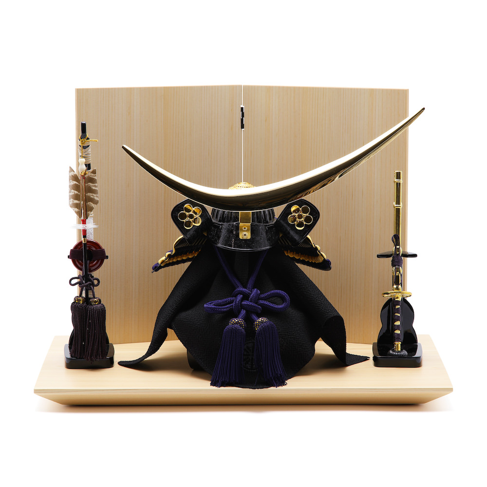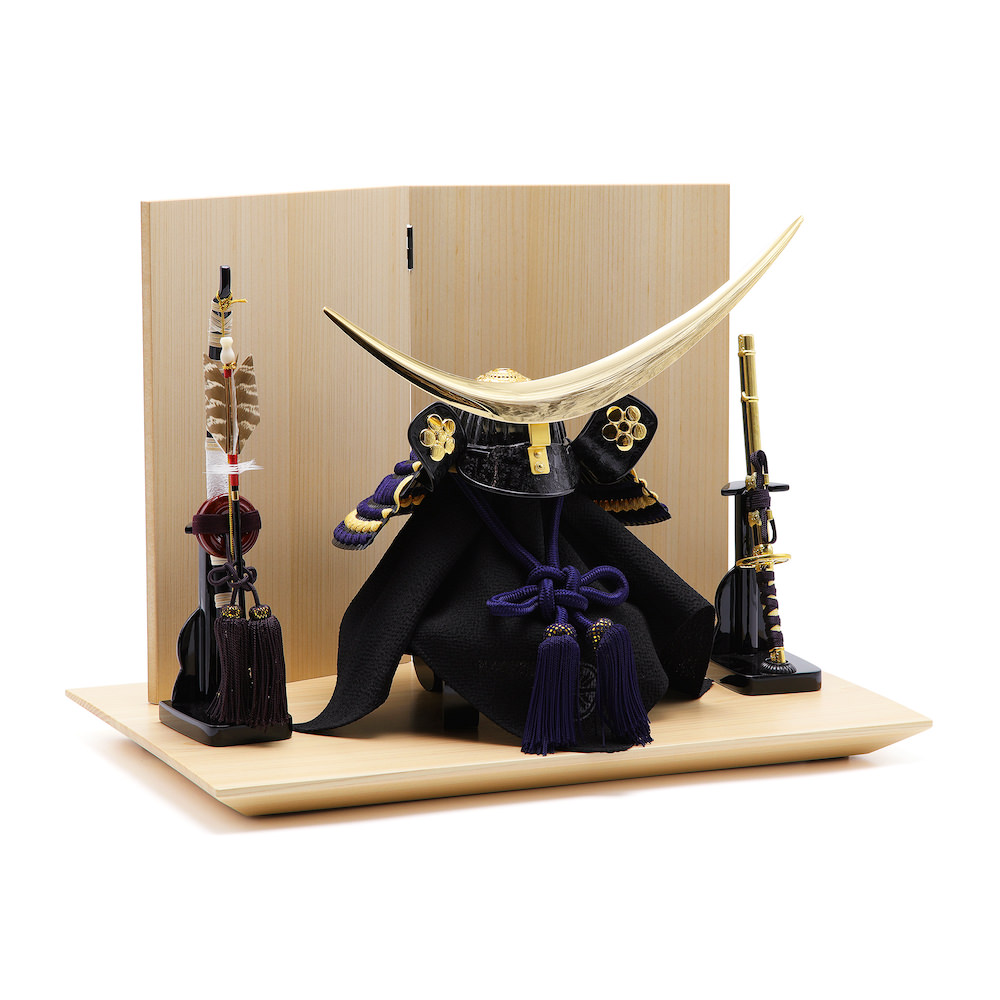 飾り台と屏風は木曽檜で制作した木目が大変美しい国産品。屏風には仕上がりが一定の柾目の素材を使用しシンプルな美しさを実現しました。屏風と飾り台の組み合わせが大変洗練されたスタイリッシュな飾りです。男らしさや逞しさを感じつつもモダンな印象の飾りに仕上げています。