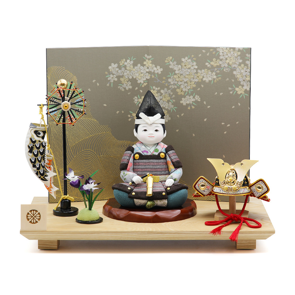 少々光沢ある黒と紺色の間の様なお色の地にお洒落な白い花柄のお衣装に、臙脂(えんじ)色の袴。鎧をイメージした胸や肩周りの木目込の衣装はすっきりとした黒、灰、紺色の地です。可愛らしくも、男の子らしい工房こだわりの木目込武者人形です。