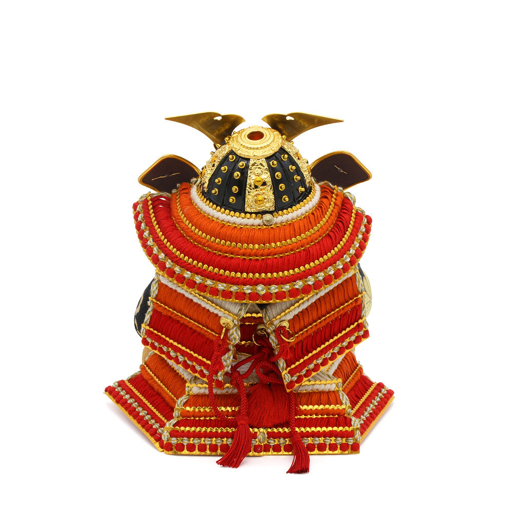 飾り台は金箔が光り輝くように美しい工房オリジナルの富山県産の高級金箔飾り台。飾り台と同様に屏風も国産の光り輝く金色が美しい洋金箔屏風です。豪華で上品なこだわりを詰め込んだ本格武者人形飾りです。勇ましさと可愛らしさ、どちらも感じる工房こだわりの武者人形は、伝統的な赤い威の鎧兜が特徴的で光り輝く様な金箔の飾り台、屏風によく似合います。