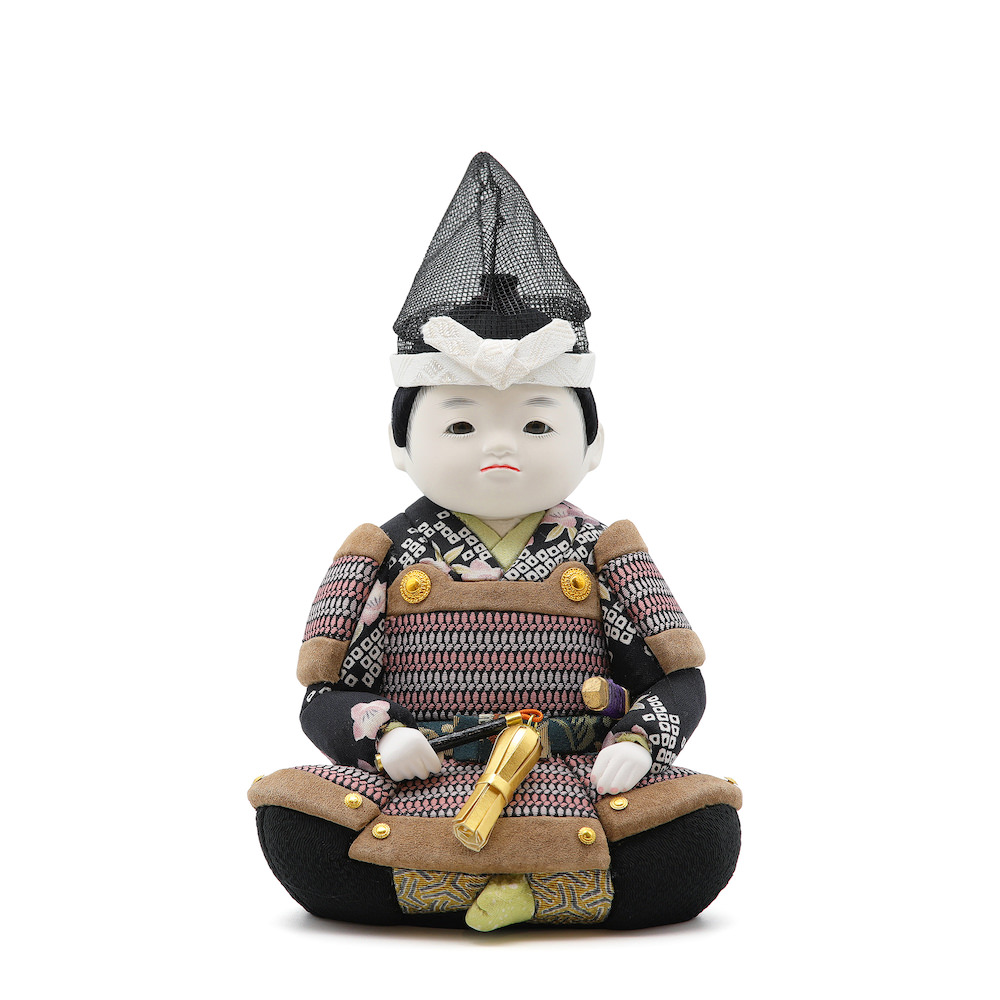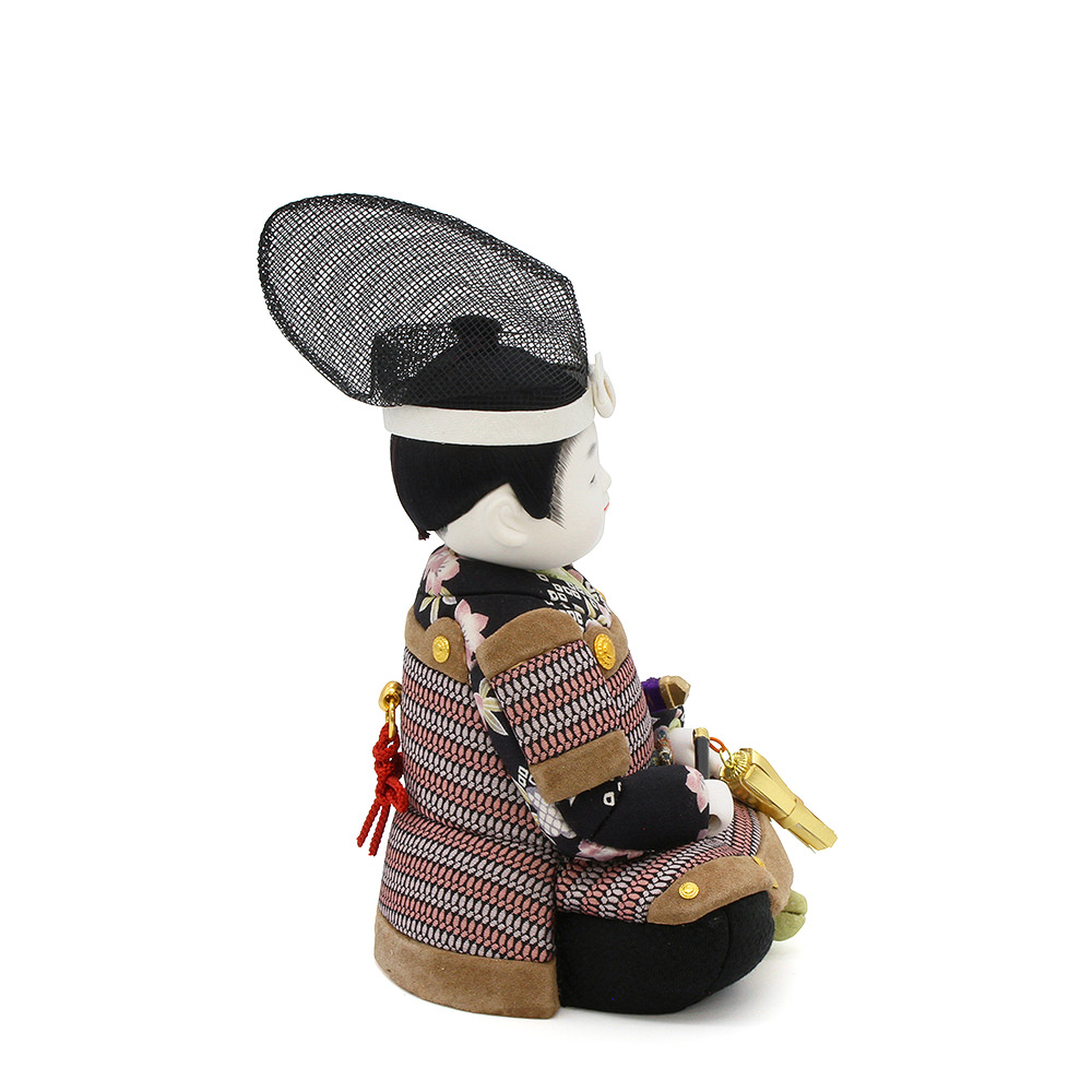 飾り台は金箔が光り輝くように美しい工房オリジナルの富山県産の高級金箔飾り台。飾り台に合わせた屏風は国産の男らしく少々無骨な印象ある荒ぶり金屏風です。上品な飾り台を活かして、小物は小さめの菖蒲の花を添えたのみで、シンプルな美しさを追求しました。シンプルな武者人形飾りですが、大変存在感ある飾りに仕上がっています。