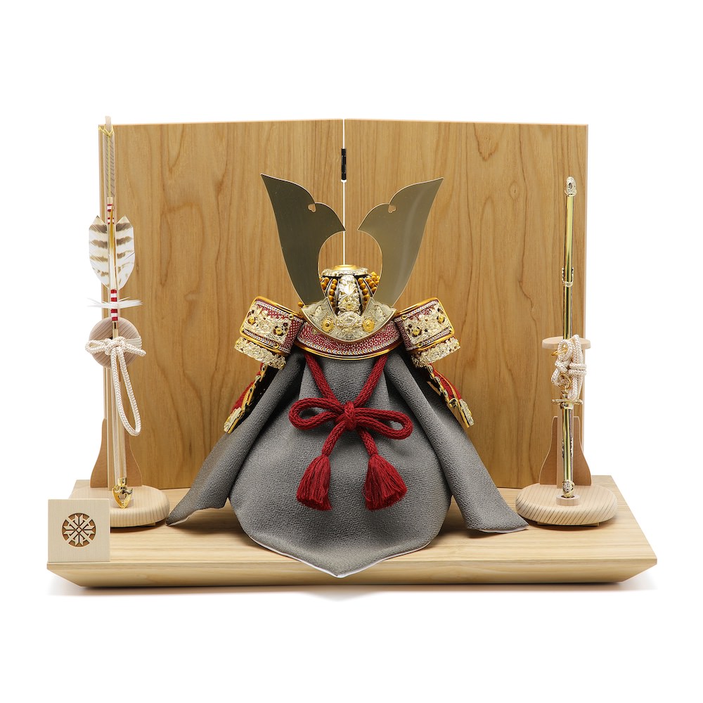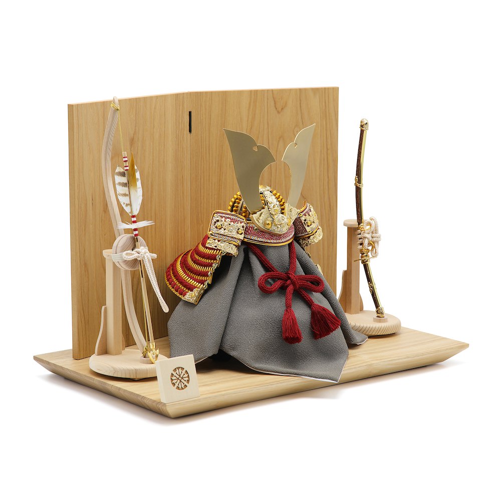 兜から小物まで全て国内の熟練職人の手で製作されたこだわりの品を選定しています。飾り台はタモの木で製作した木目が美しい木製飾り台、屏風も飾り台と全く同じ製法で製作した二曲屏風です。統一感があり、兜の存在が際立つスタイリッシュな品です。