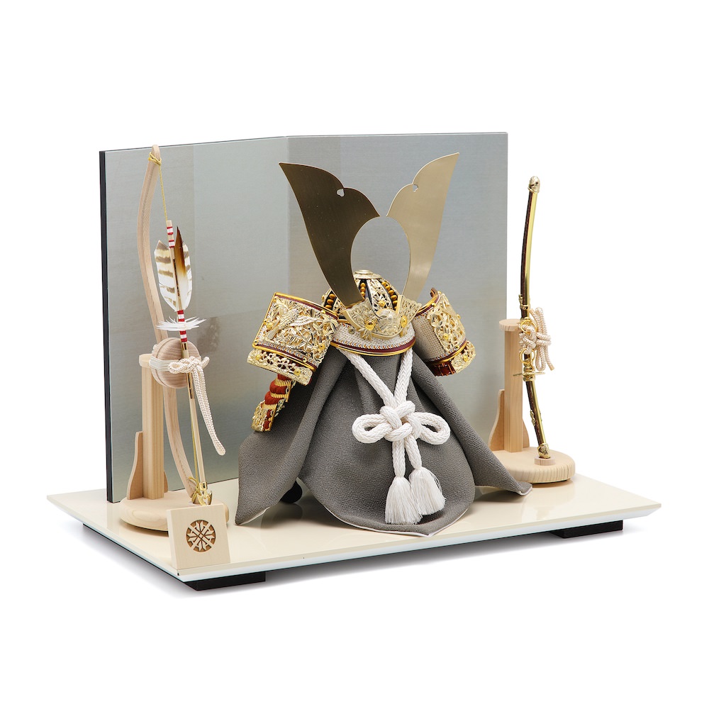 兜から小物まで全て国内の熟練職人の手で製作されたこだわりの品を選定しています。飾り台は富山県高岡漆器と同様の高級高岡塗りにて製作した白塗りの飾り台。屏風は、現代的な銀色とごく薄い青の中間色のような光沢ある屏風。静岡県にて製作したこだわりの品です。