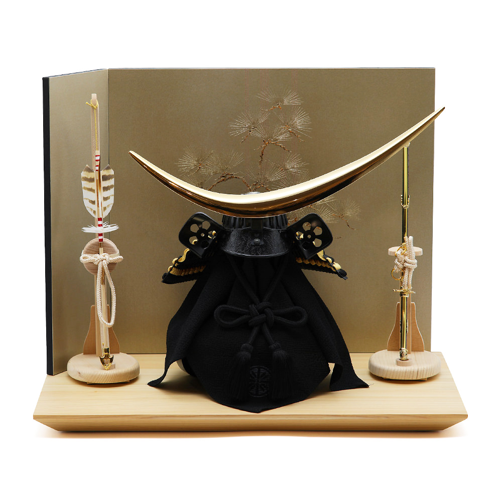 兜から小物まで全て国内の熟練職人の手で製作されたこだわりの品を選定しています。飾り台は木曽檜で製作したすっきりとした見た目の木製飾り台。屏風は静岡県で製作された金色と銀色の中間色のような落ち着いた上品な色味が特徴的な二曲屏風です。中央には松が描かれ、日本らしさとモダンさを感じる品です。端午の節句らしく男らしい弓太刀は、飾り台の木目や爽やかな屏風に似合う白木で製作した品です。男らしさや逞しさを感じつつもモダンで上品な印象の飾りに仕上げています。