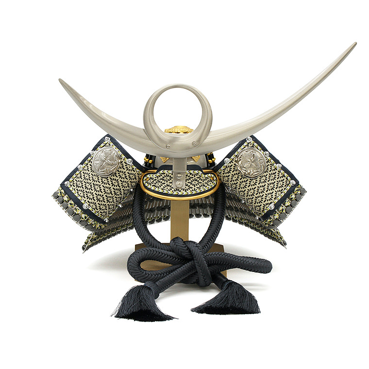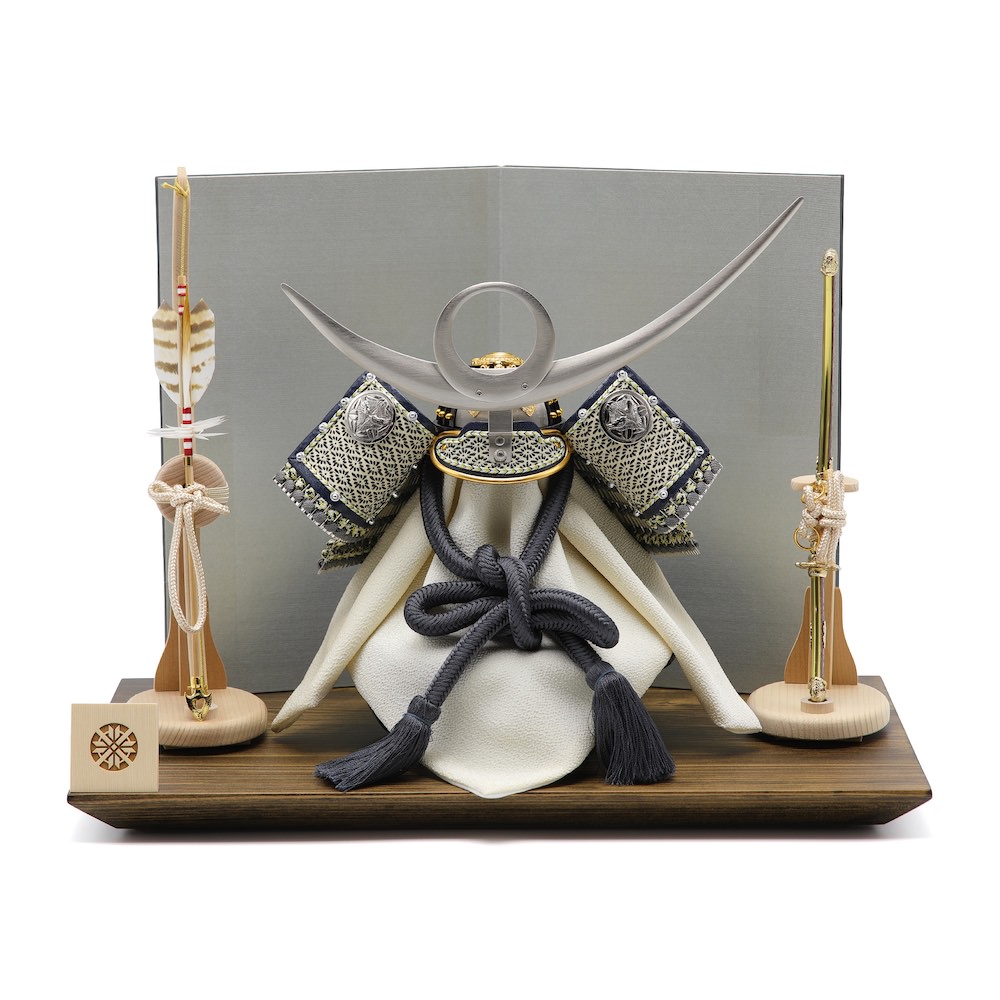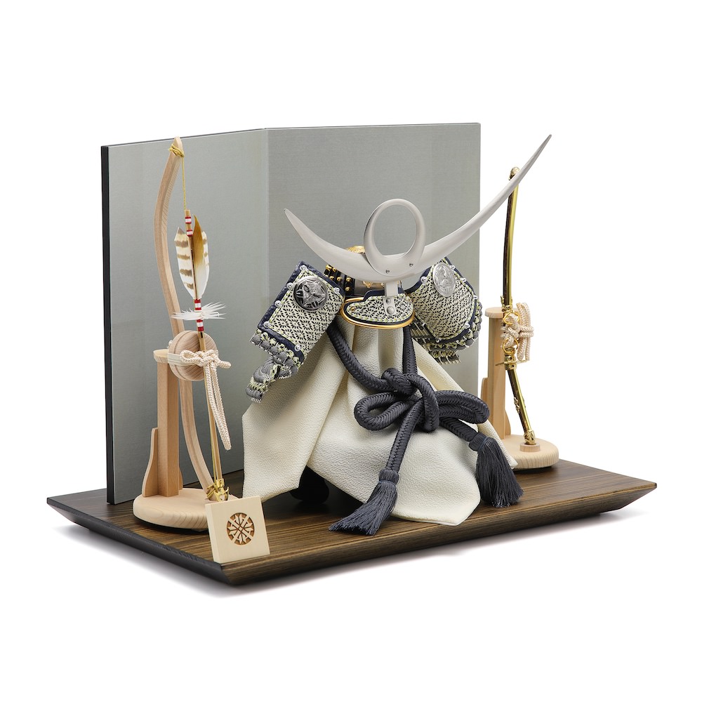 飾り台は、高岡漆器の高岡で製作した木目を活かし、漆を使って拭き漆の技法で仕上げたこだわりの国産飾り台。屏風は、現代的な銀色とごく薄い青の中間色のような光沢ある屏風。静岡県にて製作したこだわりの品です。兜の両隣には端午の節句らしく、男らしい国産の弓太刀を添えています。爽やかでモダンな白木で製作した品です。拭き漆飾り台の厳かな雰囲気と屏風、弓太刀のモダンな雰囲気から上品でありつつも、新しさを感じる飾りに仕上がっています。