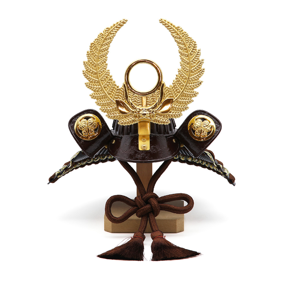 兜の両隣の端午の節句らしい弓太刀は、黒塗りに橙色が差し色の工房真の兜向けに製作したオリジナルの品。シンプルながらも洗練された迫力ある兜飾りに仕上がっています。